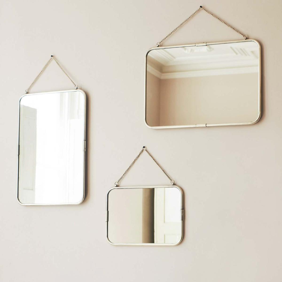 Our collection of classical silver carriage mirrors are sure to transform your home with retro design. With clean lines and effortless styling, these elegant mirrors can be hung anywhere, from your sitting room to your bedroom. Small Landscape (EMR1822): H28 x W39. 5 x D1. 5cm. Large Landscape (UNO4248): H39 x W56 x D1. 2cm. Large Portrait (URN9681): H57 x W39 x D1. 2cm. Made of brass and glass. Antiqued silver finish. To clean, use a soft moist cloth. Do not use abrasives or polish cleaner. Includes fixings at the back of the mirror to attach to the wall and decorative chain. Sold individually.