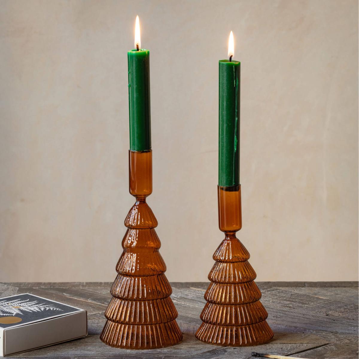Reminiscent of vintage glasswork with their grooved amber design, these Christmas tree candle holders will bring charm to your festive decorations. Watch the tiered holders glisten in ambient light, making them standout centerpieces for any table setting. Small (IRA1003): H16cm x Diameter 8cm. Medium (IRA1006): H19. 5cm x Diameter 8. 5cm. Made from glass. Suitable for long column dinner candles.