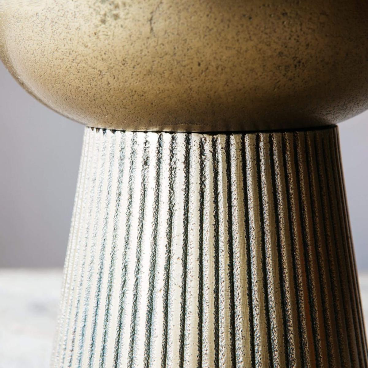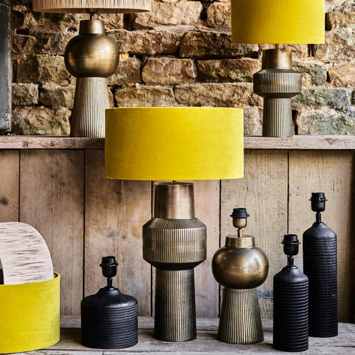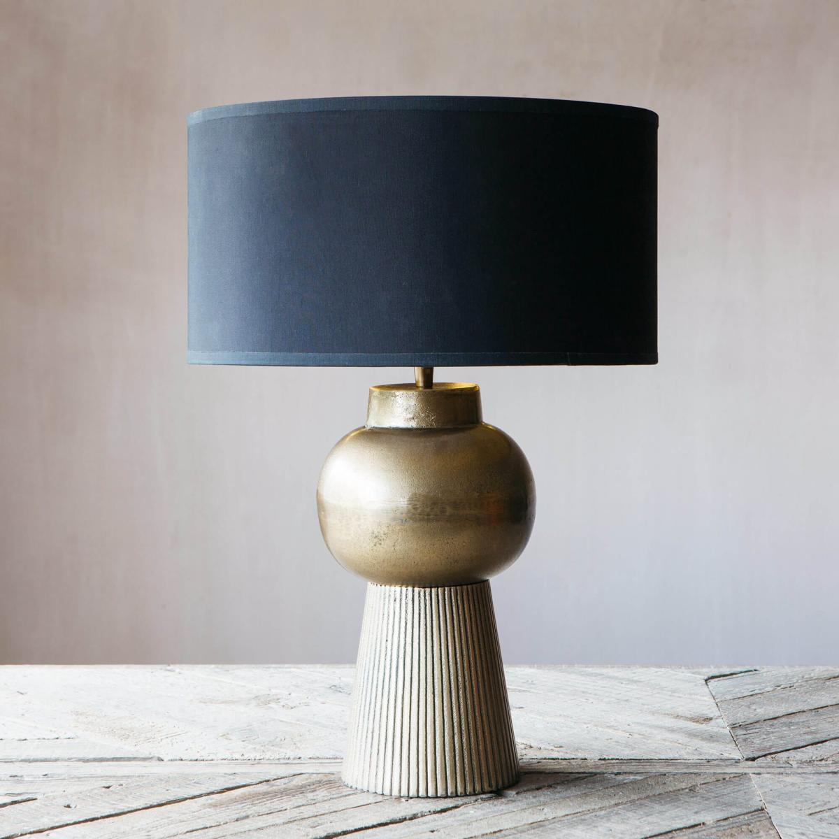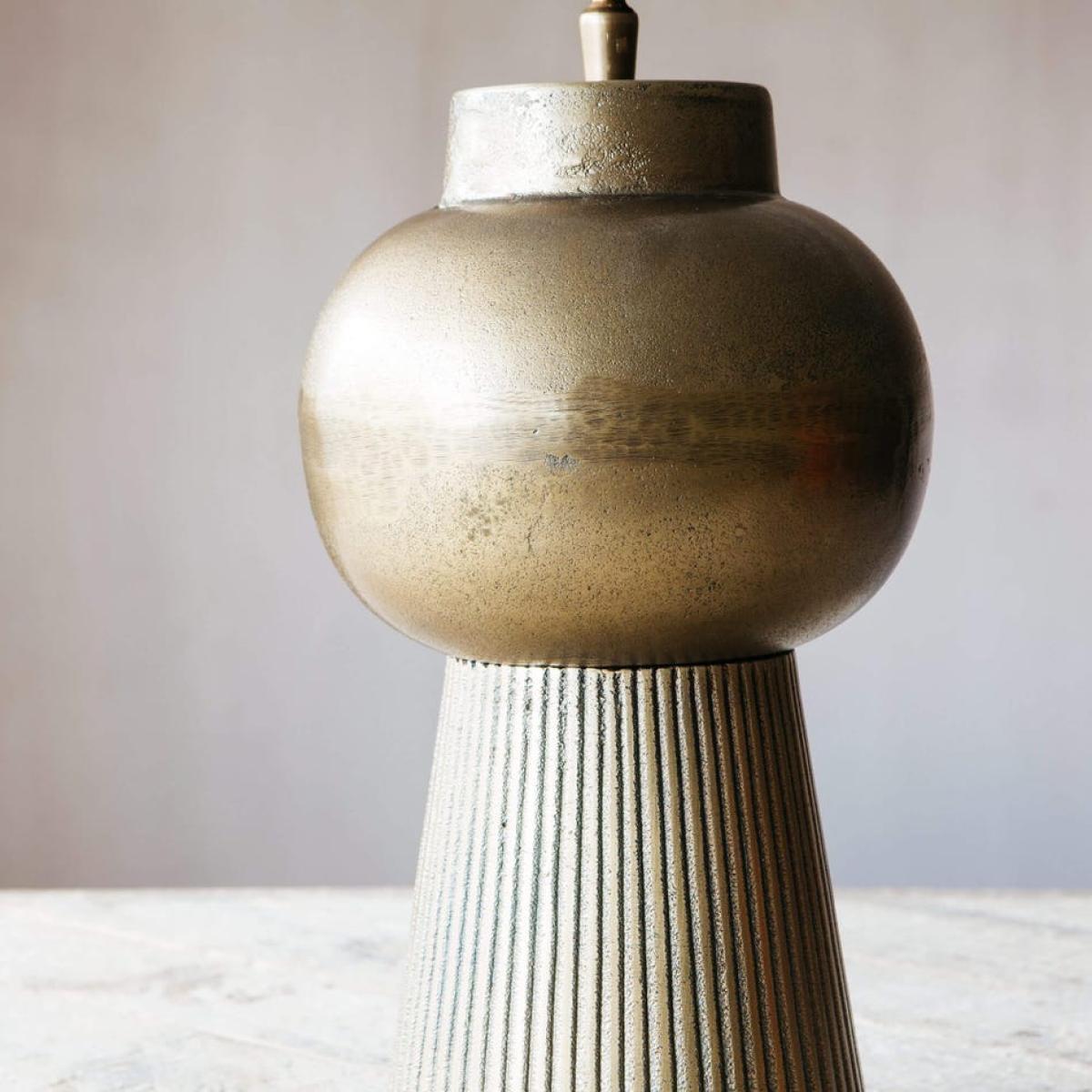 Minimalism with an artistic flair, this sculptural table lamp features a round bulb on a ribbed conical base and is finished in a warm bronze colour that exudes style. H33 x Diameter 18cm. Shown with our 14" Black and Gold Cotton Lamp Shade (not included).Requires 1 x E27 Max 40W bulb (not included).Made of metal.