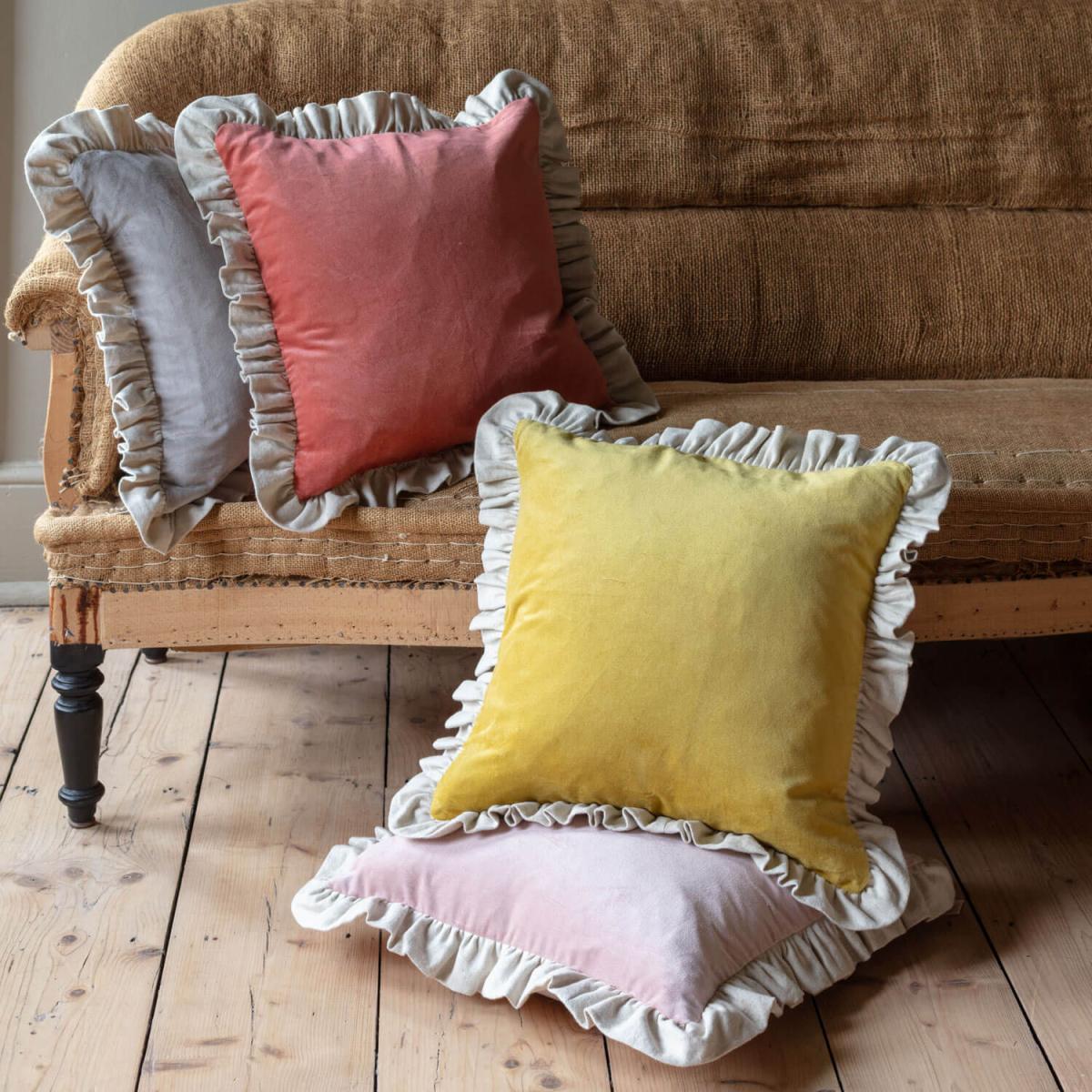 These cushions are a contrast of sumptuous velvet with a cool, natural linen frill which will bring a delicate touch to any living space. Each one comes with a generous feather filling for extra comfort and would be perfectly paired with soft linen bed sheets or a cosy velvet sofa. H45cm x W45cm. Soft 100% cotton velvet and a linen/cotton mix. Feather filled cushion pad included. Dry clean only. The velvet colour may vary slightly, dependent on the light.
