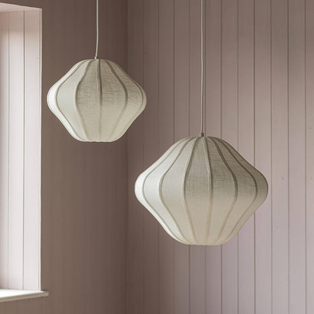 Softly sculptural with a dreamy, organic form, these linen pendant lights cast a warm and inviting glow. Crafted with a delicate fabric stretched over a lightweight frame, their curved silhouettes add an effortless sense of movement and texture to any space.