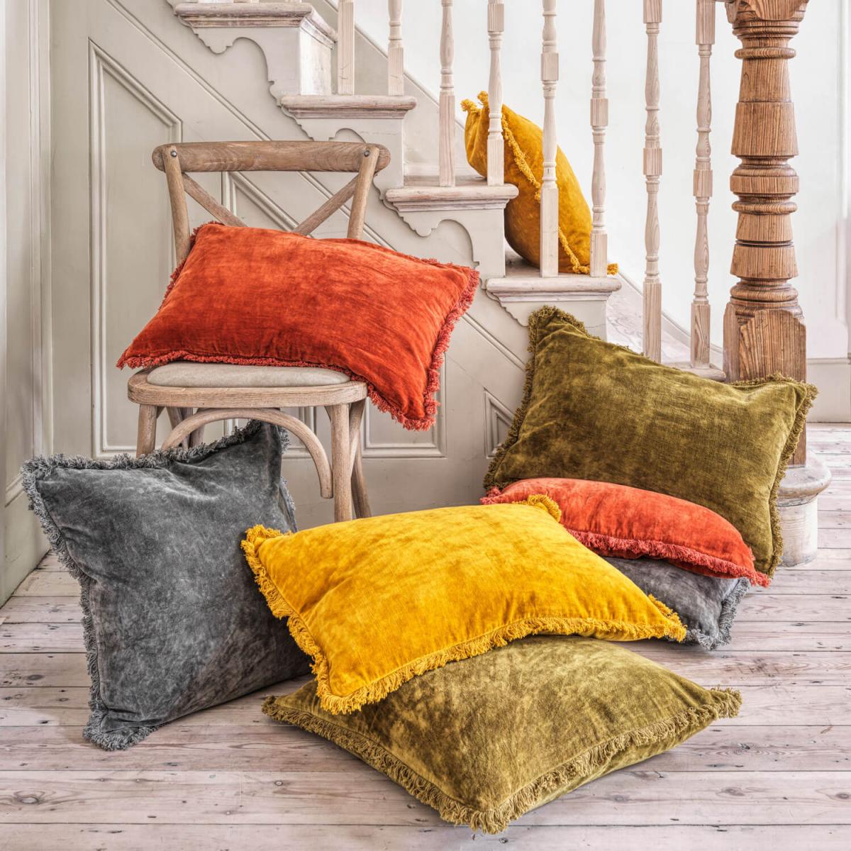 Richly coloured and textured, these velvet cushions have been stonewashed; a traditional method where the fabric is tumbled with pumice stones to create a smooth, worn-in look and vintage feel. Each removeable cover is finished with subtle fringing and filled with a feather pad.  H50 x W50cm. Traditionally stonewashed velvet cover with a zip. Includes a feather cushion pad. The exact colour and finish may vary due to the stonewashing process.