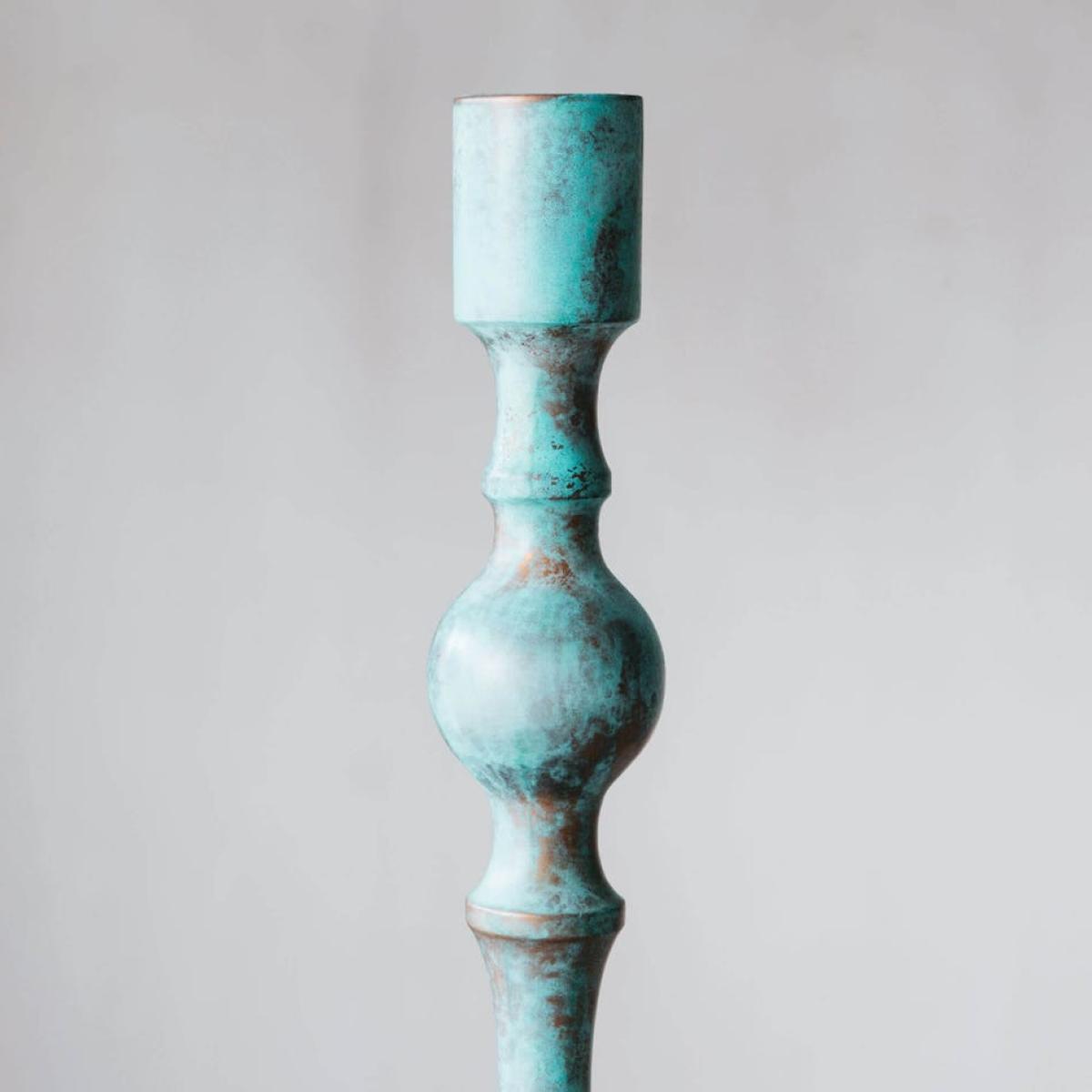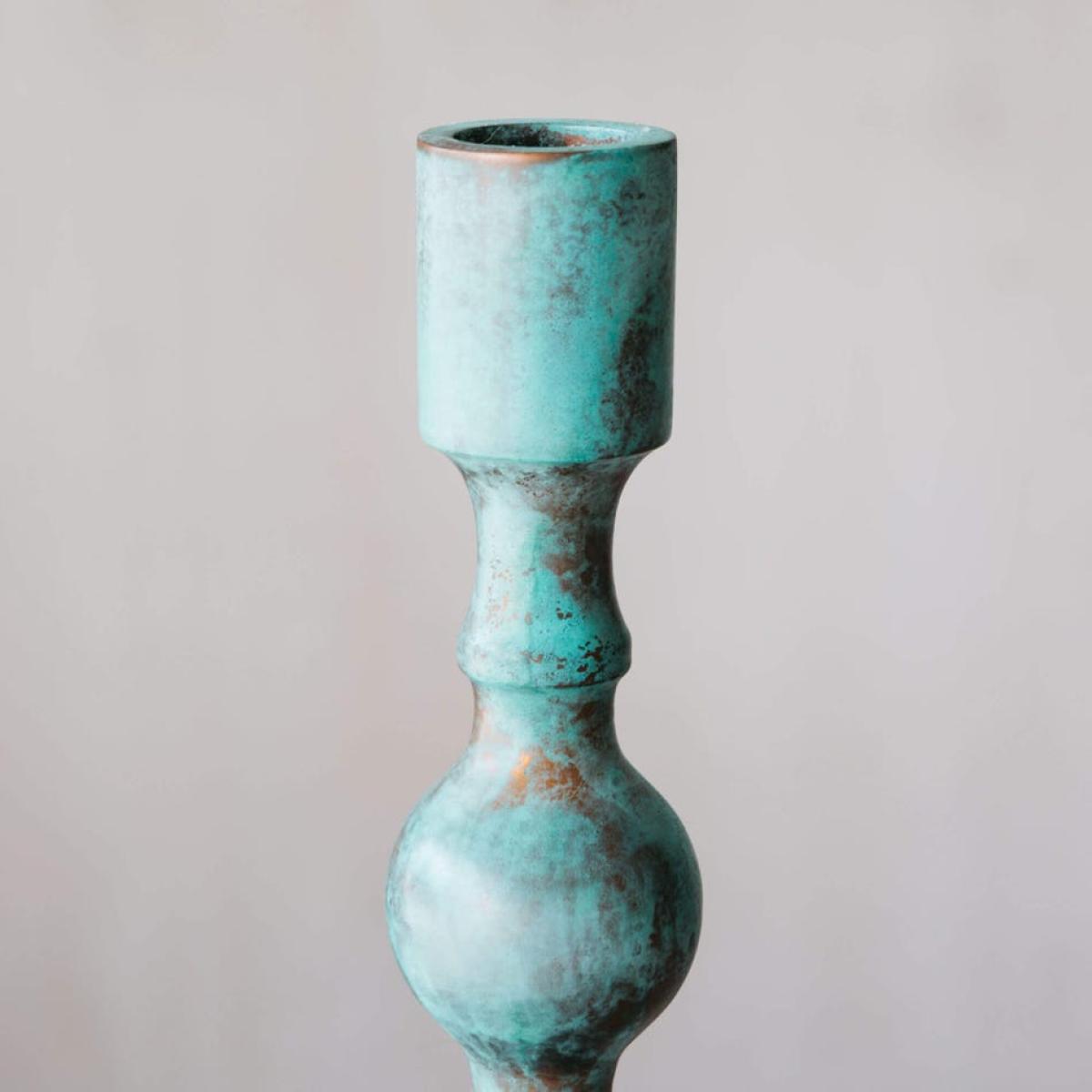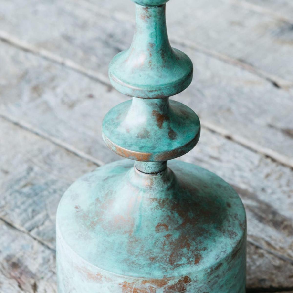 Crafted from copper that has been oxidised to create a naturally antiqued bluish-green patina, this wide metal candle holder is the perfect rustic accessory for your home.