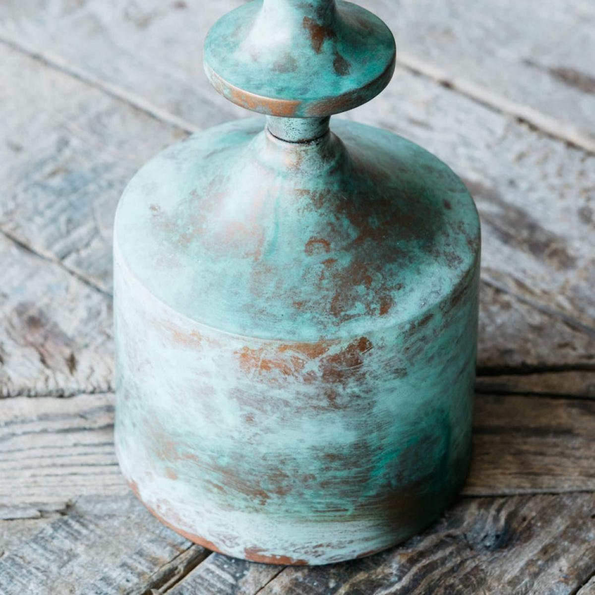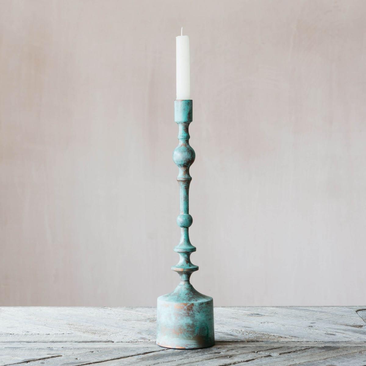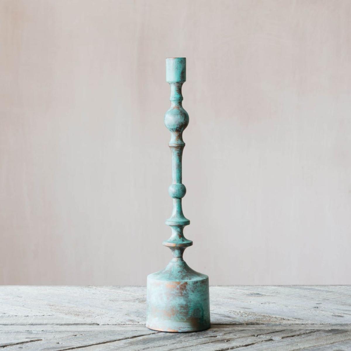 Crafted from copper that has been oxidised to create a naturally antiqued bluish-green patina, this wide metal candle holder is the perfect rustic accessory for your home.