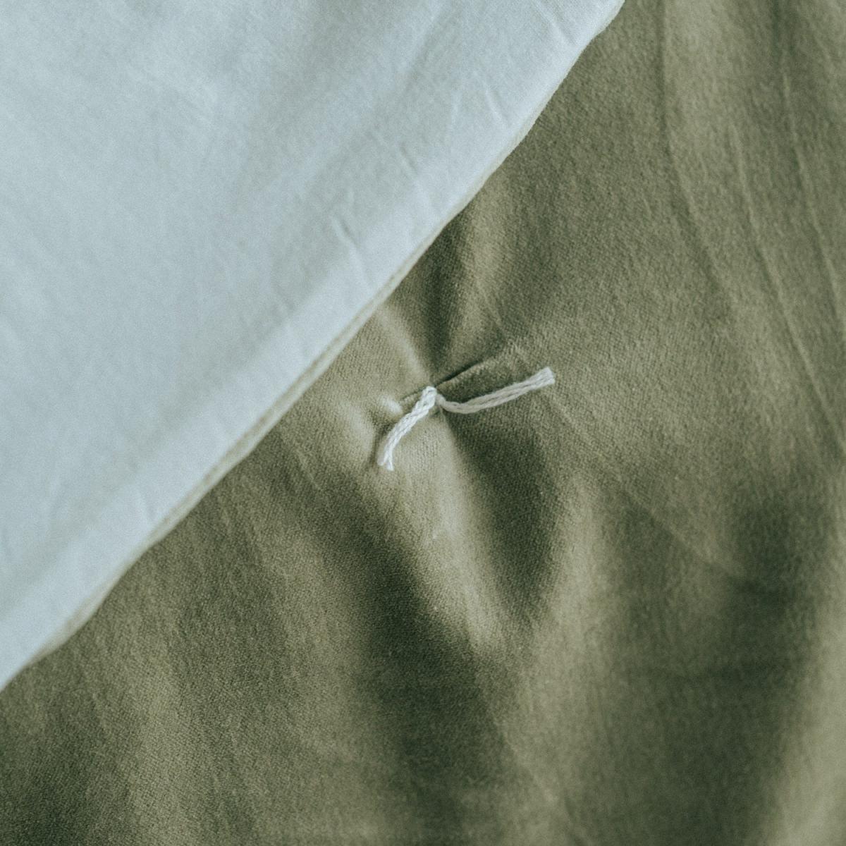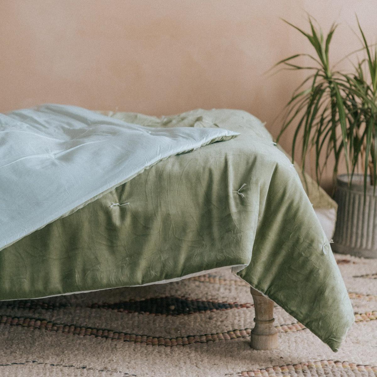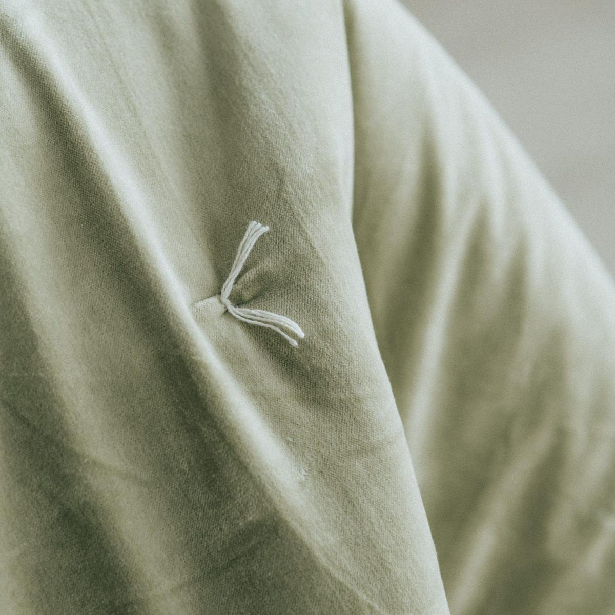 Sleep soundly under our beautifully soft velvet pebble quilts. Each quilt is fronted in luxuriously soft thyme green cotton velvet with hand-knotted tassel detailing and backed with ivory cotton voile, for envious bedroom soft furnishings.