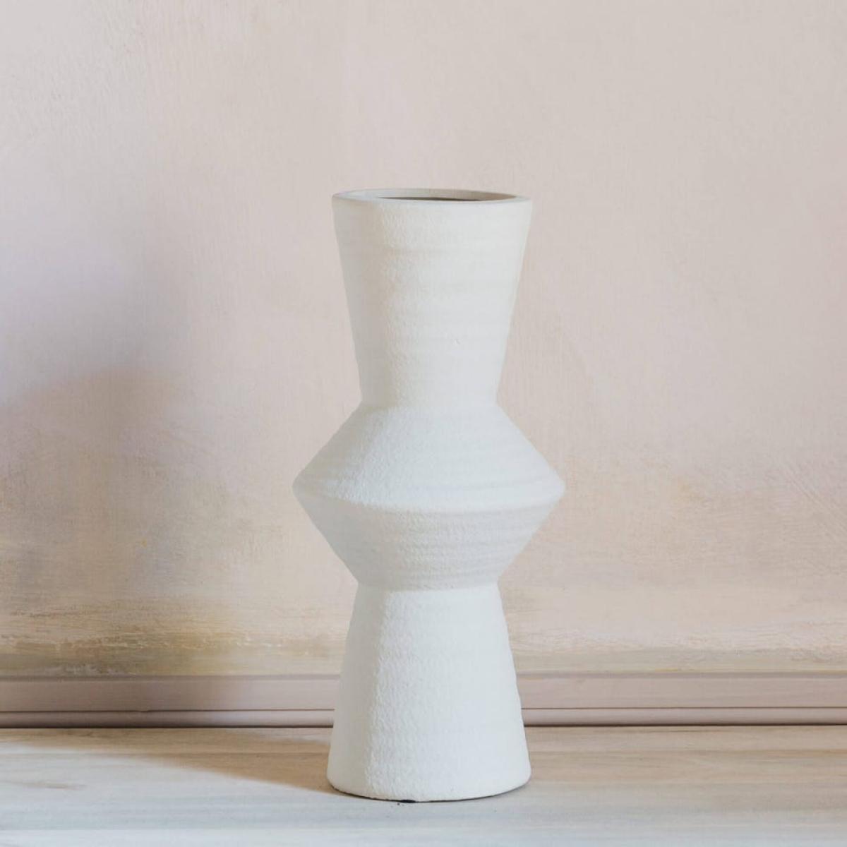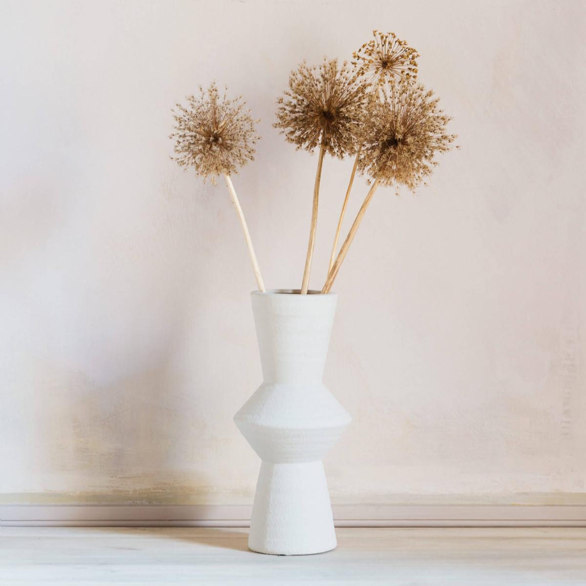I really like the white Cyrus vase for its clean, sculptural shape and subtle texture, making it versatile across various interiors. It works particularly well in minimalist or Scandinavian spaces, where its simplicity enhances the overall calm aesthetic. For styling tips, try pairing it with dried flowers or grasses like pampas or thistles for an effortless, modern look. It also makes a statement when filled with fresh blooms in neutral tones, adding a touch of elegance without overwhelming the space. Its understated design makes it ideal for both sideboards and coffee tables, offering flexibility while maintaining a refined feel.