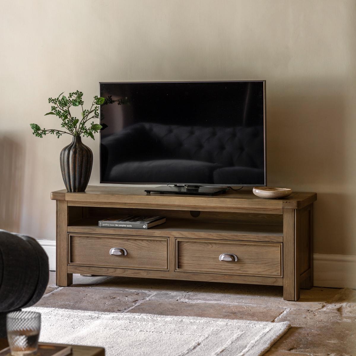 I love this media unit for its clean, understated design that works well in both contemporary and rustic interiors. Its natural wood finish adds warmth and texture, making it versatile for various colour schemes. It’s particularly effective in rooms with a cosy, laid-back vibe or understated Scandi interiors. Practical styling tips include layering with a mix of objects like books, plants, and minimal table lamps to create interest without clutter. Its drawers and open shelf provide smart storage, helping keep your media space organised and clutter-free, while the sturdy construction makes it ideal for supporting TVs of different sizes. This piece would work well in living rooms or open-plan spaces where understated elegance and functional storage are priorities.