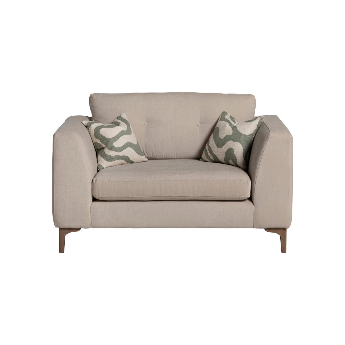 I’m a fan of this cuddler because its clean lines and neutral linen-look fabric make it a versatile base for almost any living space. It’s roomy enough to curl up on but keeps a neat silhouette, so it works equally well in a contemporary city flat or a more relaxed country pad. The turned-wood legs add a subtle nod to mid-century style without shouting for attention. For styling, I’d anchor it with a low-pile rug in a soft geometric print and a mix of textured cushions in muted greens or terracotta to introduce colour. A slim side table or a pair of nesting trays fits neatly beside it for drinks and books, while a lightweight wool throw over one arm creates that lived-in yet tidy look. Since the fabric is neutral, you can easily switch accessories by season or mood without overhauling your sofa.