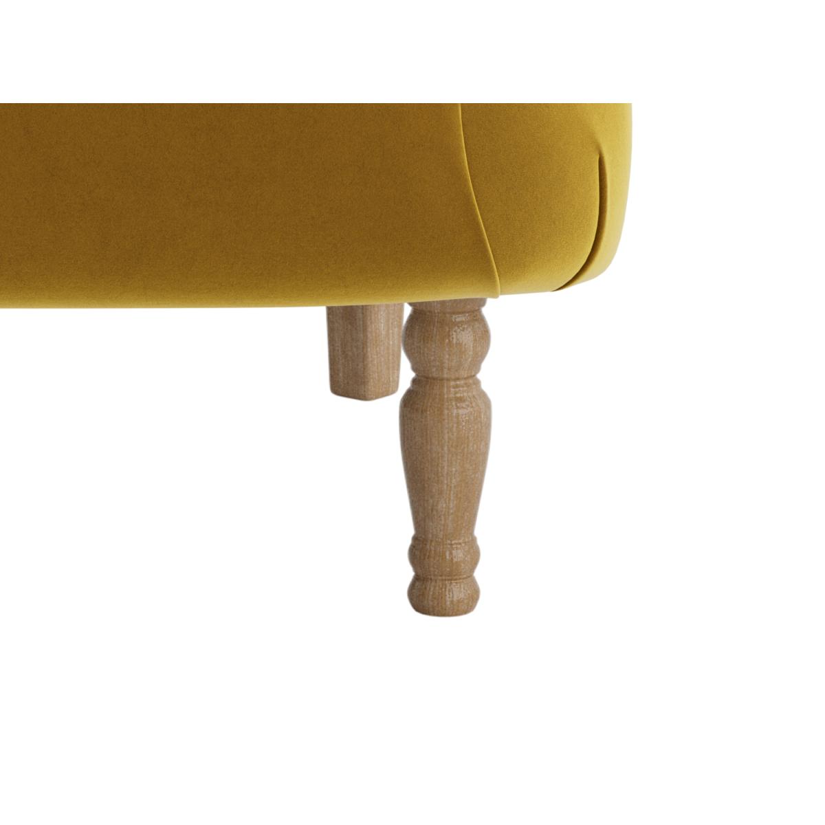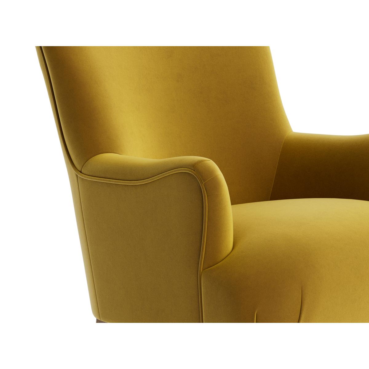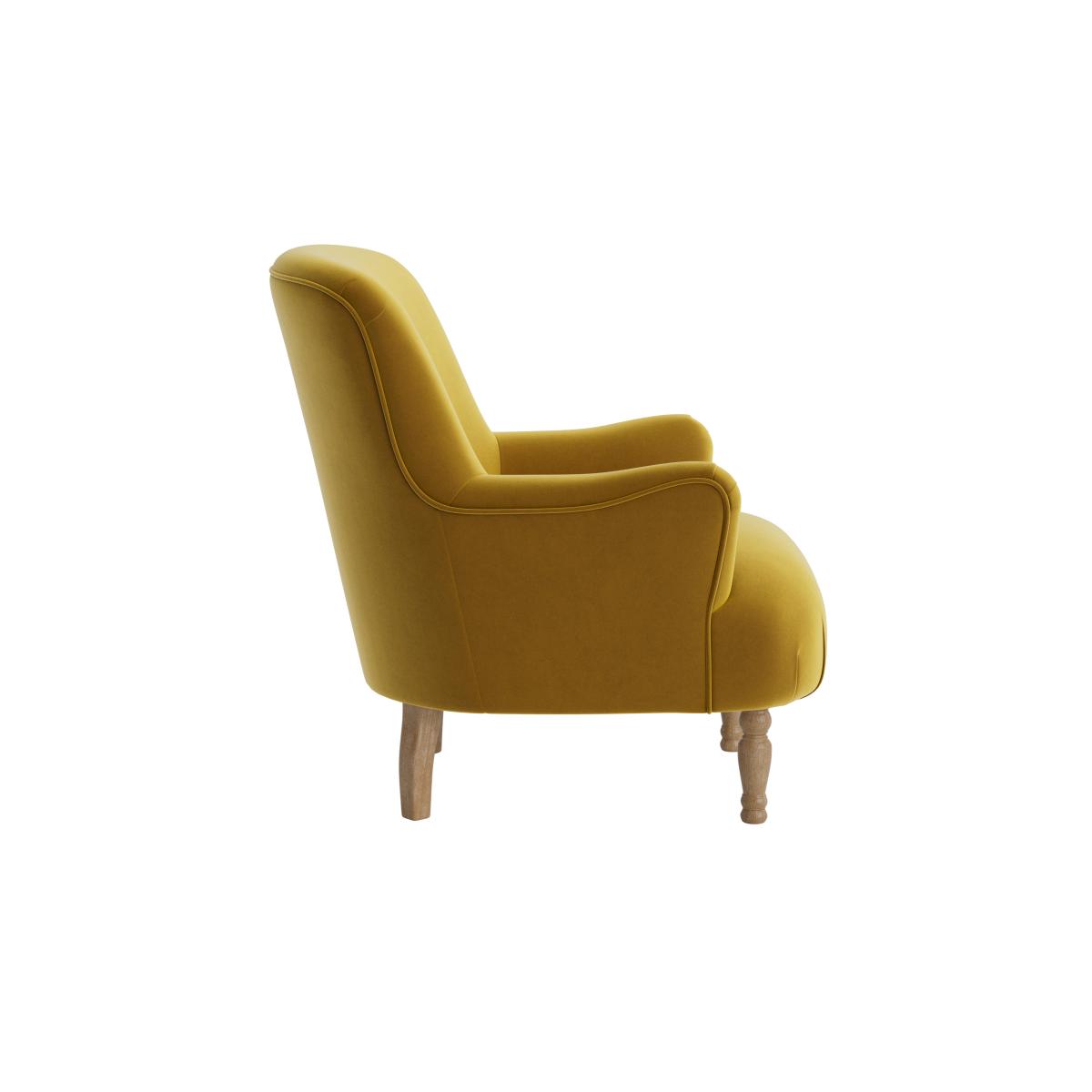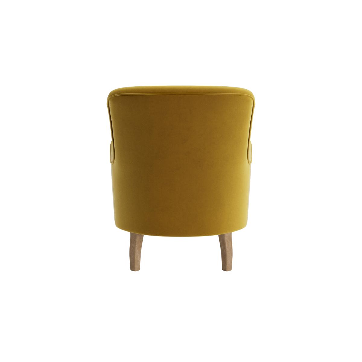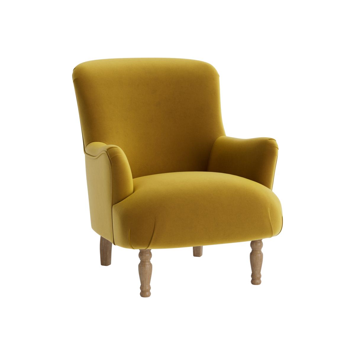I love this armchair because of its classic yet playful design-the bold mustard colour makes it a statement piece, perfect for adding a pop of colour to neutral interiors. It works well in eclectic, vintage-inspired, or mid-century modern settings, where its timeless silhouette can be showcased as a standout feature. Practical styling tips include pairing it with cosy throws and cushions for a inviting look, or positioning it in a corner to create a welcoming reading nook. Its sturdy wooden legs give it a slightly formal touch, making it versatile enough to suit both casual living rooms and more refined spaces.