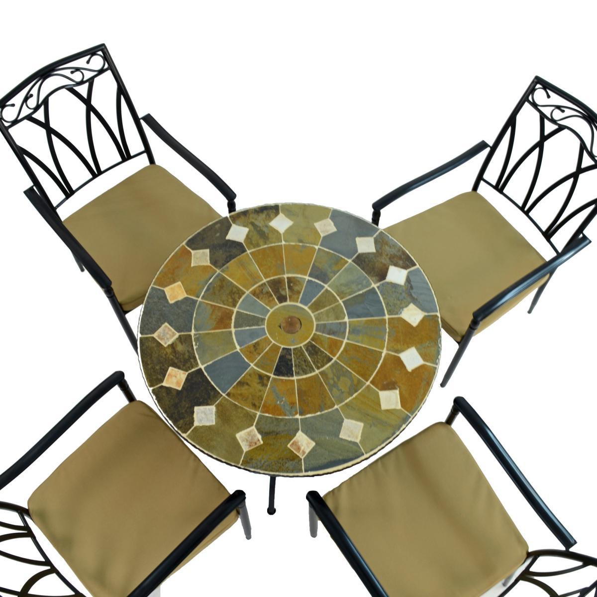 This luxurious dining set features a stunning stone mosaic design table, perfect for adding the wow factor to your garden. The heavy table top is supported by strong steel legs which are powder coated black leaving a smooth and slightly glossed finish. The Ascot Chairs are deep-seated stacking chairs that have a robust frame and the decorative ornate backrest, they would look great alongside any grandiose table either indoors or outside. The chairs also include shower proof cushions with removable covers for added comfort.