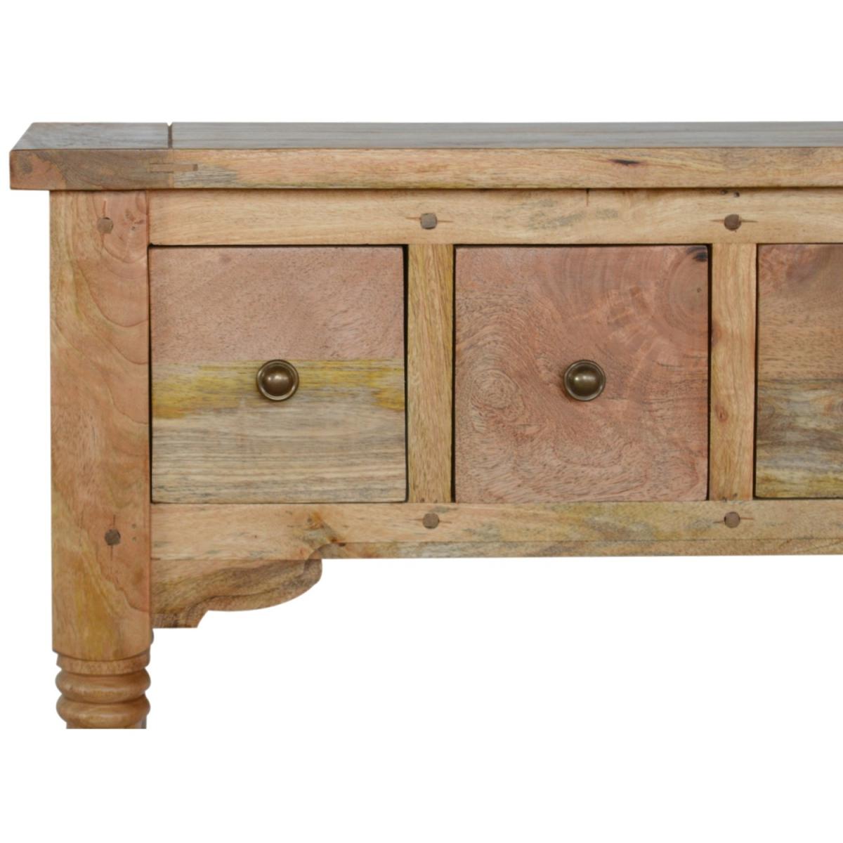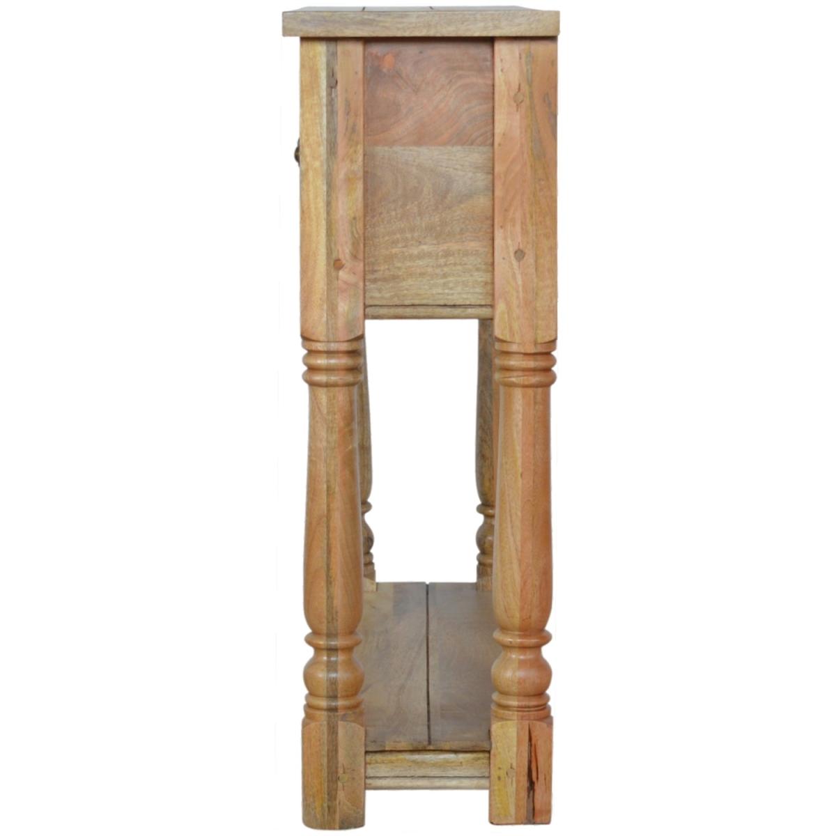 The perfect piece of furniture for any living space is this narrow console table, which is constructed from 100% solid mango wood and is hand distressed with an oak-ish finish. It has features such as hand-turned legs, four drawers that come with shiny handles, and a lower shelf for extra storage.