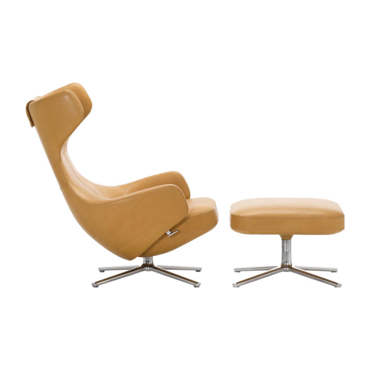 Designed in 2012 by Antonio Citterio, the Grand Repos Chair and Ottoman in natural leather, manufactured by Vitra, offers the ultimate in seating comfort. With generous padding, inviting armrests and a high back, the Grand Repos armchair fulfils almost all demands with respect to comfortable, relaxing seating. Featuring biomechanical adjustment options, the chair adjusts to the sitter's position and weight to offer exceptional support and can be locked in any desired position. Developed in Switzerland by Vitra in collaboration with Italian designer and architect, Antonio Citterio in 2012, the Grand Repos combines timeless elegance with unsurpassed comfort. After years of experience creating dynamic seating for home and workspace, Citterio applies his expertise to the private living area to award the space with comfort and sculptural design. Upholstered in sophisticated high-grade natural leather, the beautifully stitched leather cover offers a classic and inviting finish, while the natural hue allows the iconic pieces to harmonize with an array of interiors.