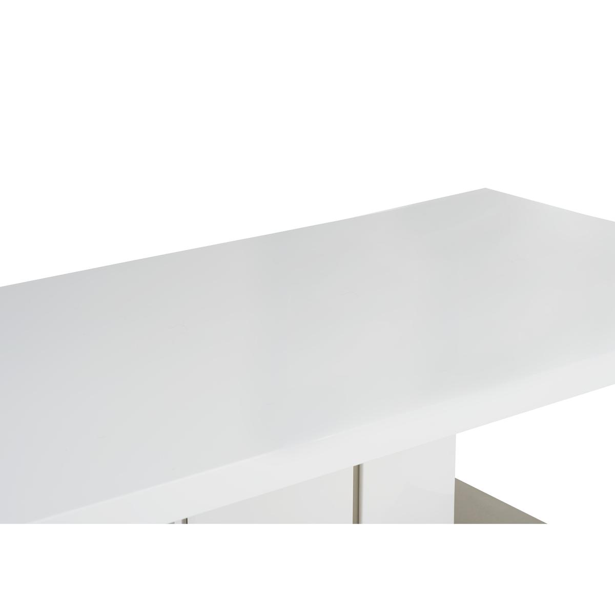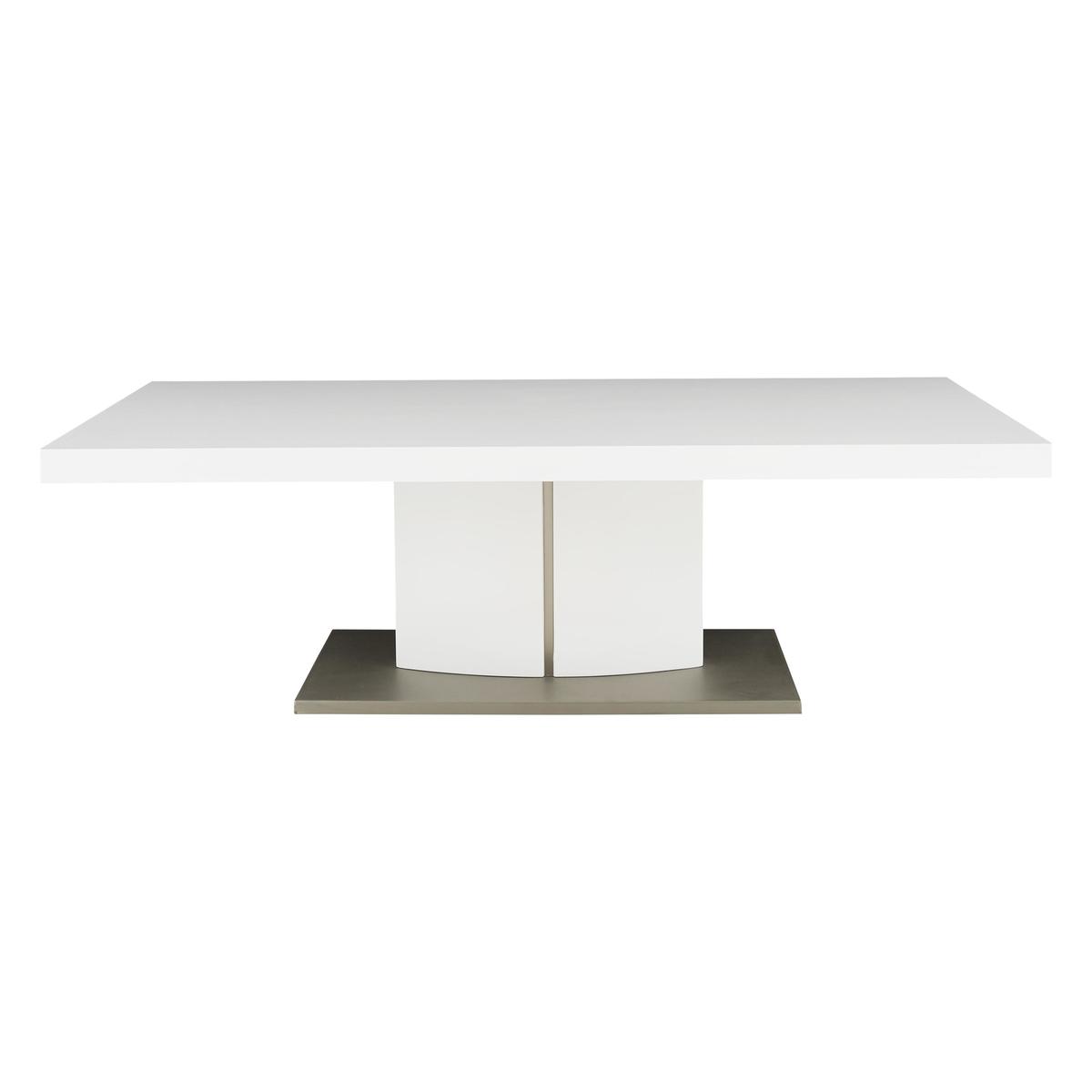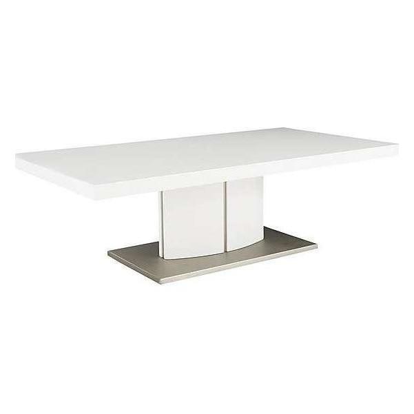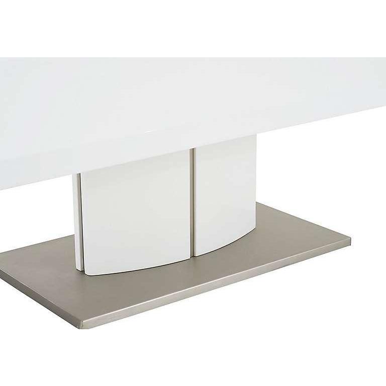 Bright, white glossy modern pedestal style coffee table. Striking broad yet low silhouette. High gloss white top with UV finish for extra durability. Curved high gloss white pedestal base with steel detailing. Pedestal rests on a rectangular, stainless steel base. Creates a feeling of light and space in a minimalist interior. Clean ultra-modern style for the contemporary home. Did you know? Hairline marks are a natural feature of this furniture's beautiful, high gloss finish.