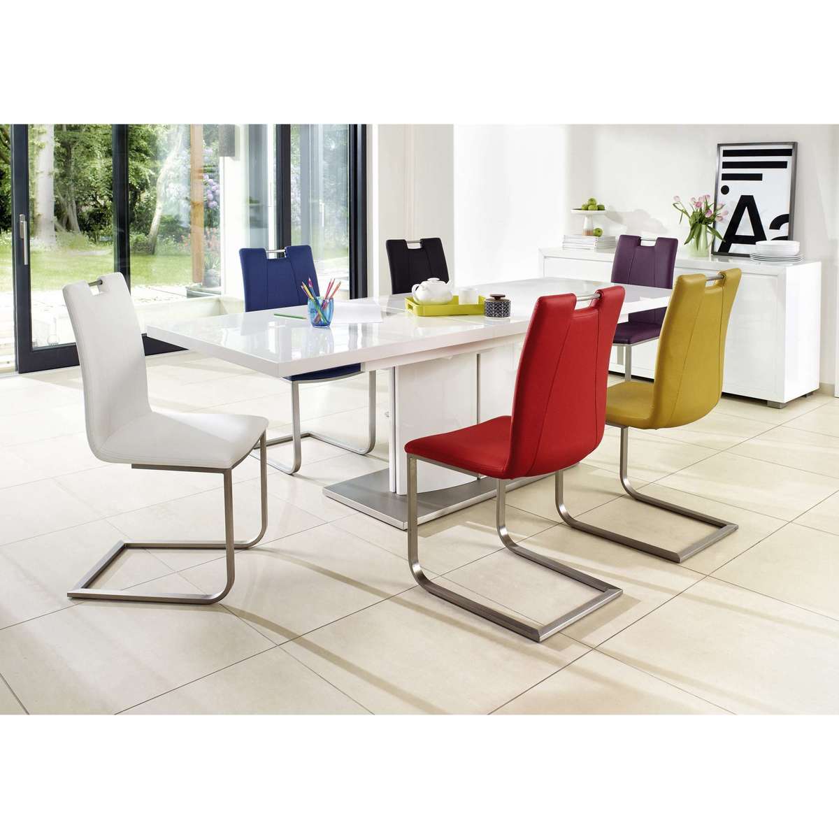 Contemporary and colourful ultra-modern dining chair;Cantilevered, tubular brushed stainless steel legs;Angled seat back for extra comfort;Hard-wearing PVC upholstery in 6 colours;Attractive geometric stitching;Integral metal handle;Uniquely styled for the modern home