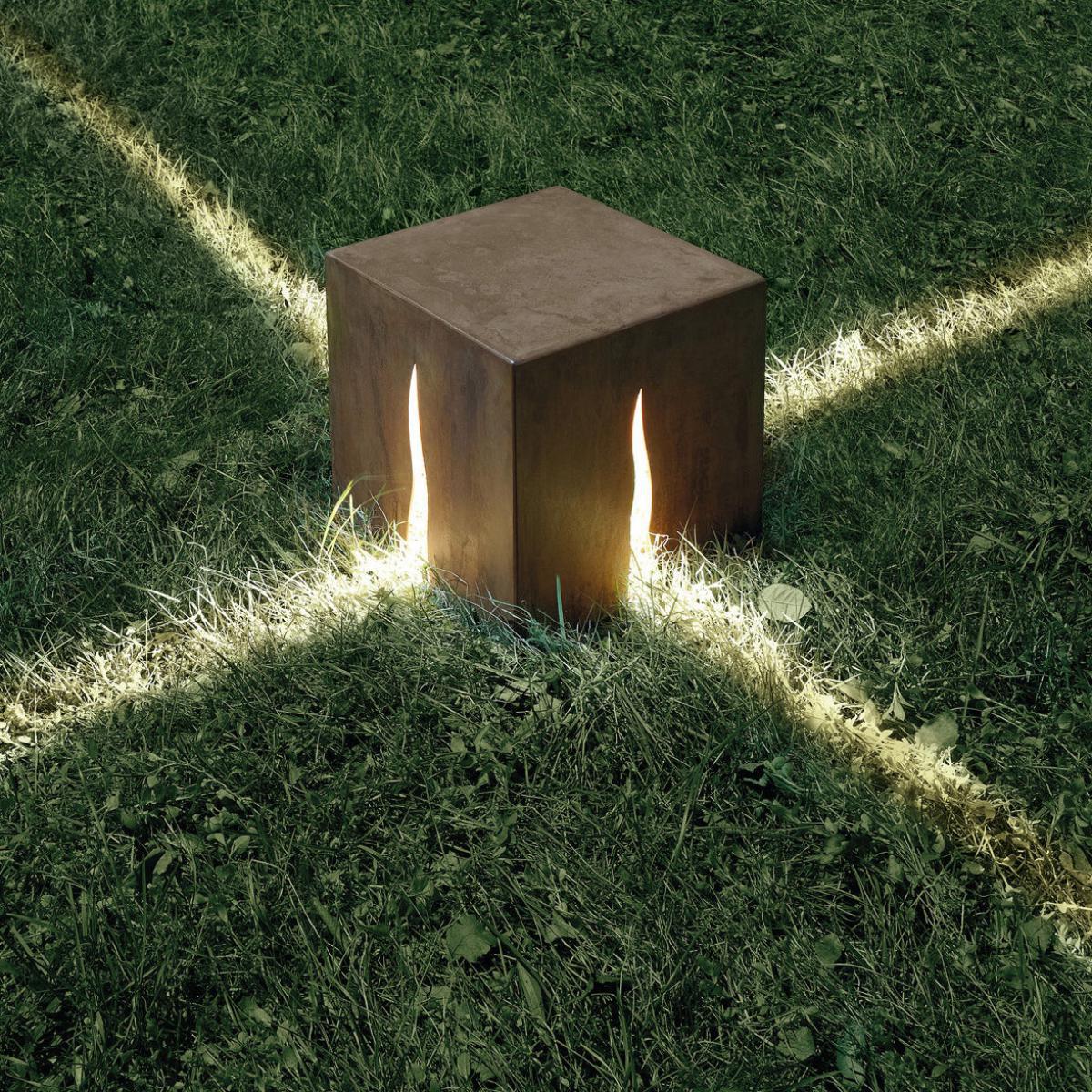 Outdoor lamp. The four light beams projected through the fissures on the sides make it particularly suitable for lighting drives or to create light effects in parks and gardens. Cor-ten (weathering steel) structure, which is distinguished for its high resistance to corrosion and high mechanical resistance.