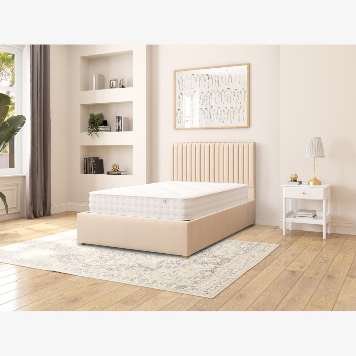 Quality upholstered ottoman storage bed, hand crafted in the UK. Each headboard is constructed with deep foam padding perfect for sitting up in bed and reading. We believe quality has no short cuts, meaning all our designs are hand upholstered by our skilled craftsmen. Our UK ottoman design features chunky upholstered panels, which means it is built to last. Quality sprung slats improve comfort and mattress lifespan. The easy lift ottoman mechanism is supported with quality gas pistons, enabling the storage to be accessed with minimal effort. Once the ottoman is elevated it will hold position, allowing hands free access to storage. Our ottomans offer the perfect storage solutions for rooms with no or limited space with a spacious storage area of approximately 28cm. The fabric base attaches to the underside of the bed, protecting your stored items. Each ottoman is finished with hardwood feet which have been hand turned and varnished.