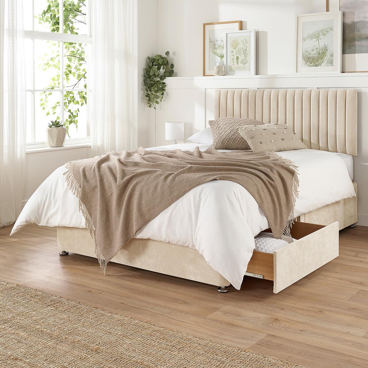 Create a sanctuary of elegance and practicality in your bedroom with the Grant Divan. Style meets storage, and comfort meets craftsmanship, in the form of a beautifully stitched fluted headboard paired with an upholstered base. Napoli Linen fabric is renowned for its soft-to-touch texture and remarkable durability. A distintive woven finish ensures timeless elegance and is hardwearing. The base features smooth ball bearing glide movement for easy access to your belongings, and the divan is easily movable thanks to stylish gliding feet. The Grant Divan is also available with a mattress, and with a 4 drawer storage option. Product details: • Divan base • Vertical Channel Stitch Padded headboard • Matching headboard is supplied with solid wood mounting struts for easy installation • Four Drawer Storage • Metal runners and ball bearing glide movement • Hand upholstered in linen fabric • Meets all UK safety standards • Made to order • Made in the UK • 1 year warranty Composition - Linen Fabric (100% polyester), wood frame, foam fillings Product dimensions • Small Double 190 cm x 120 cm x 102 cm, Weight - 60 KG • Double 190 cm x 135 cm x 102 cm, Weight - 60 KG • King 200 cm x 150 cm x 102 cm, Weight - 66 KG • Super King 200 cm x 180 cm x 102 cm, Weight - 75 KGDivan height from floor to sleeping area without mattress - 38cm Internal drawer dimensions - 51.5cm x 72.5cm x 12.5cm. Small Double: • Parcel 1 Packaged Dimensions - 190 cm x 120 cm x 38 cm, Weight 26 kg • Parcel 2 Packaged Dimensions - 190 cm x 120 cm x 38 cm, Weight 26 kg • Parcel 3 Packaged Dimensions - 120 cm x 54 cm x 6 cm, Weight 8 kg. Double: • Parcel 1 Packaged Dimensions - 190 cm x 135 cm x 38 cm, Weight 26 kg • Parcel 2 Packaged Dimensions - 190 cm x 135 cm x 38 cm, Weight 26 kg • Parcel 3 Packaged Dimensions - 135 cm x 54 cm x 6 cm, Weight 8 kg. King: • Parcel 1 Packaged Dimensions - 200 cm x 150 cm x 38 cm, Weight 28 kg • Parcel 2 Packaged Dimensions - 200 cm x 150 cm x 38 cm, Weight 28 kg • Parcel 3 Packaged Dimensions - 150 cm x 54 cm x 6 cm, Weight 10 kg Super King: • Parcel 1 Packaged Dimensions - 200 cm x 150 cm x 38 cm, Weight 31 kg • Parcel 2 Packaged Dimensions - 200 cm x 150 cm x 38 cm, Weight 31 kg • Parcel 3 Packaged Dimensions - 150 cm x 54 cm x 6 cm, Weight 13 kg. This product will be dispatched by one of our trusted suppliers. You’ll be contacted by their selected courier about your delivery. Please note this item will be delivered to your doorstep. Please note that this item cannot be delivered to the Offshore Islands, Northern Ireland or the Republic of Ireland. ASPIR01