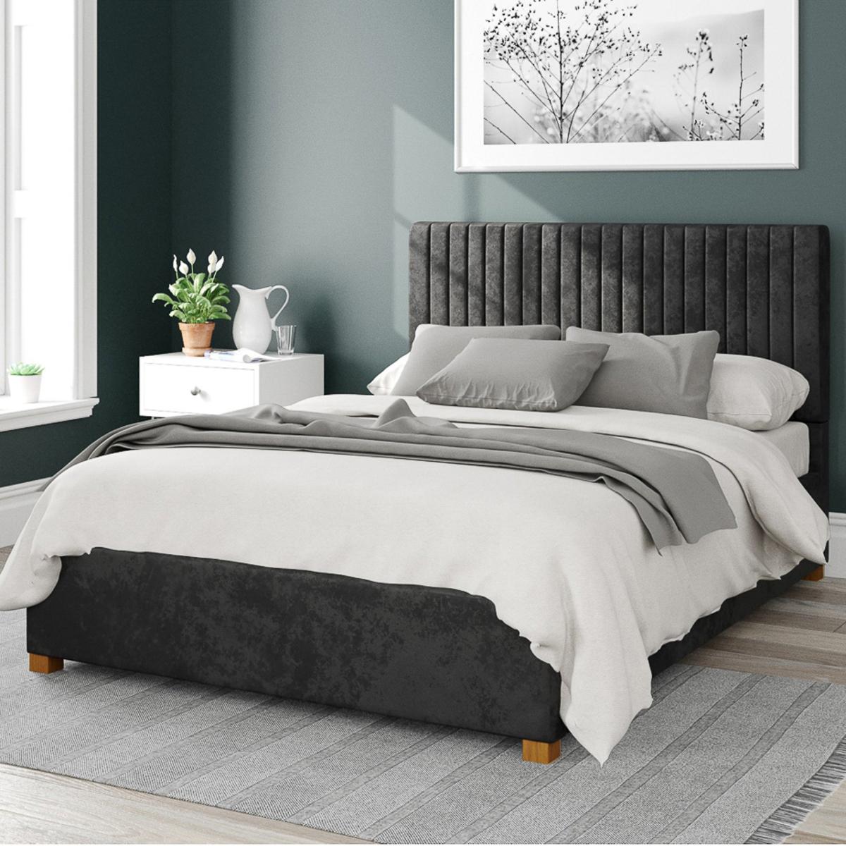 * Velvet fabric ottoman bed* Vertical line headboard design* Contemporary Grant range* Hand upholstered with deep padding* Large storage area with fabric dust protection sheet* Hands free access to storage (mattresses up to 60kg) - mattress not included* Solid hardwood feet* Manufactured in the UK Whether you’re trying to maximise storage in a small space, or you have clutter that you’d prefer to keep out of sight, this contemporary style ottoman bed from the Grant range offers style and functionality too! Designed with a statement vertical headboard design and hand upholstered in a velvet fabric in a range of striking colours, a deep padding is included for added comfort. Featuring quality spring slats that provide support for a peaceful night's sleep and a large storage area designed to provide ample space for all your bedding and accessories, the ottoman design can be easily accessed with gas lift pistons, so once the mechanism is open it will hold in place and a fabric dust protection sheet is there to keep your belongings clean and tidy. Manufactured in the UK, the bed comes complete with solid hard wood feet to provide a stable foundation that finish the look and ensure the bed remains sturdy and secure, while also adding a touch of elegance to the overall design.