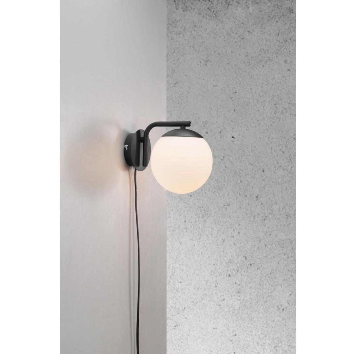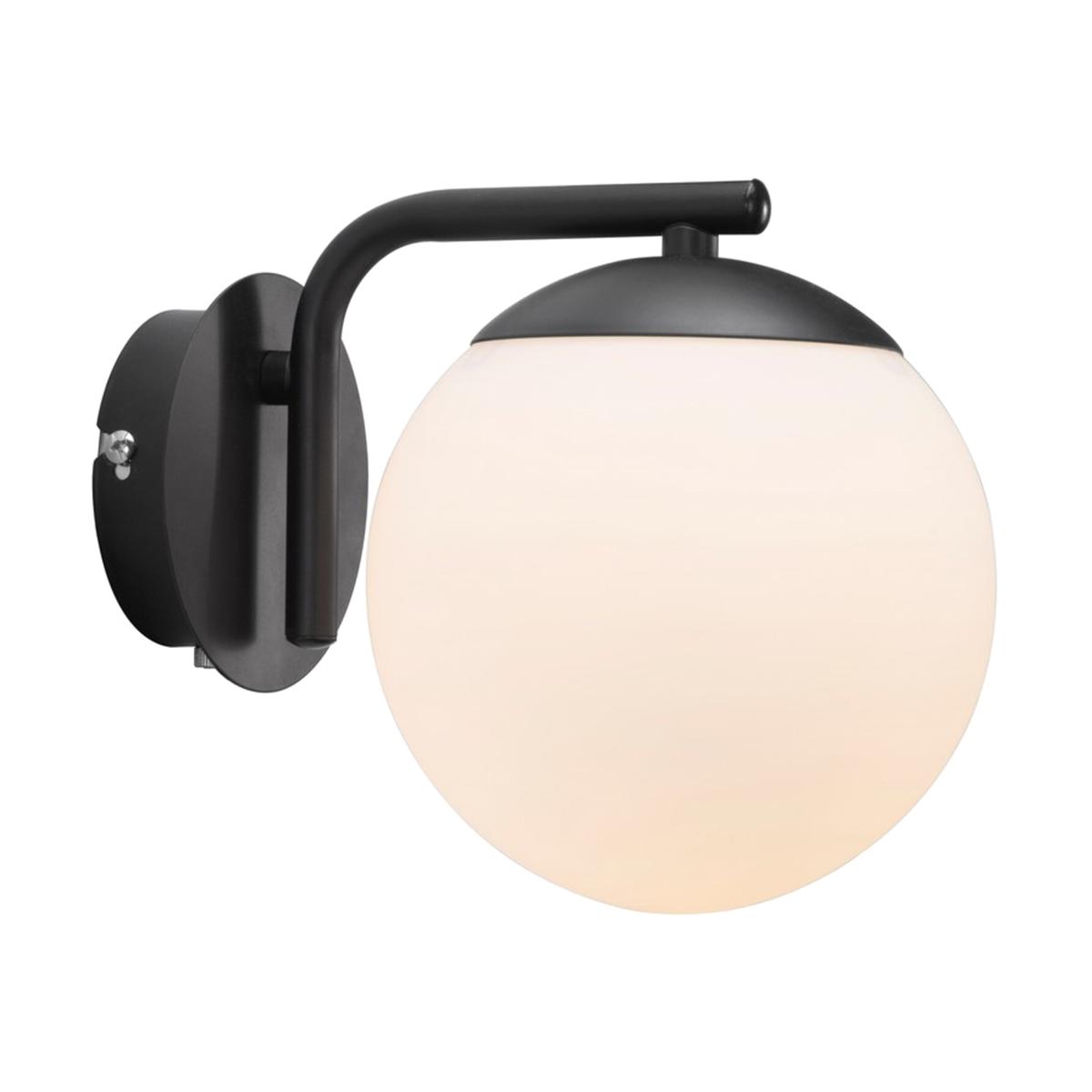 Art deco style. Matte white opal mouth blown glass. Provides a soft, diffused light, The 15cm Grant Black Wall Lamp is an easy way to lend a contemporary touch to your decor. Its glamorous globe is crafted in matte white opal mouth-blown glass to provide lovely diffuse light while the sleek black base and arm add modern flair to light up an entryway or corridor.