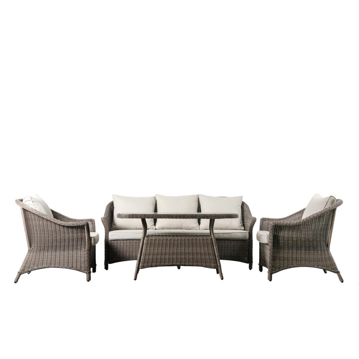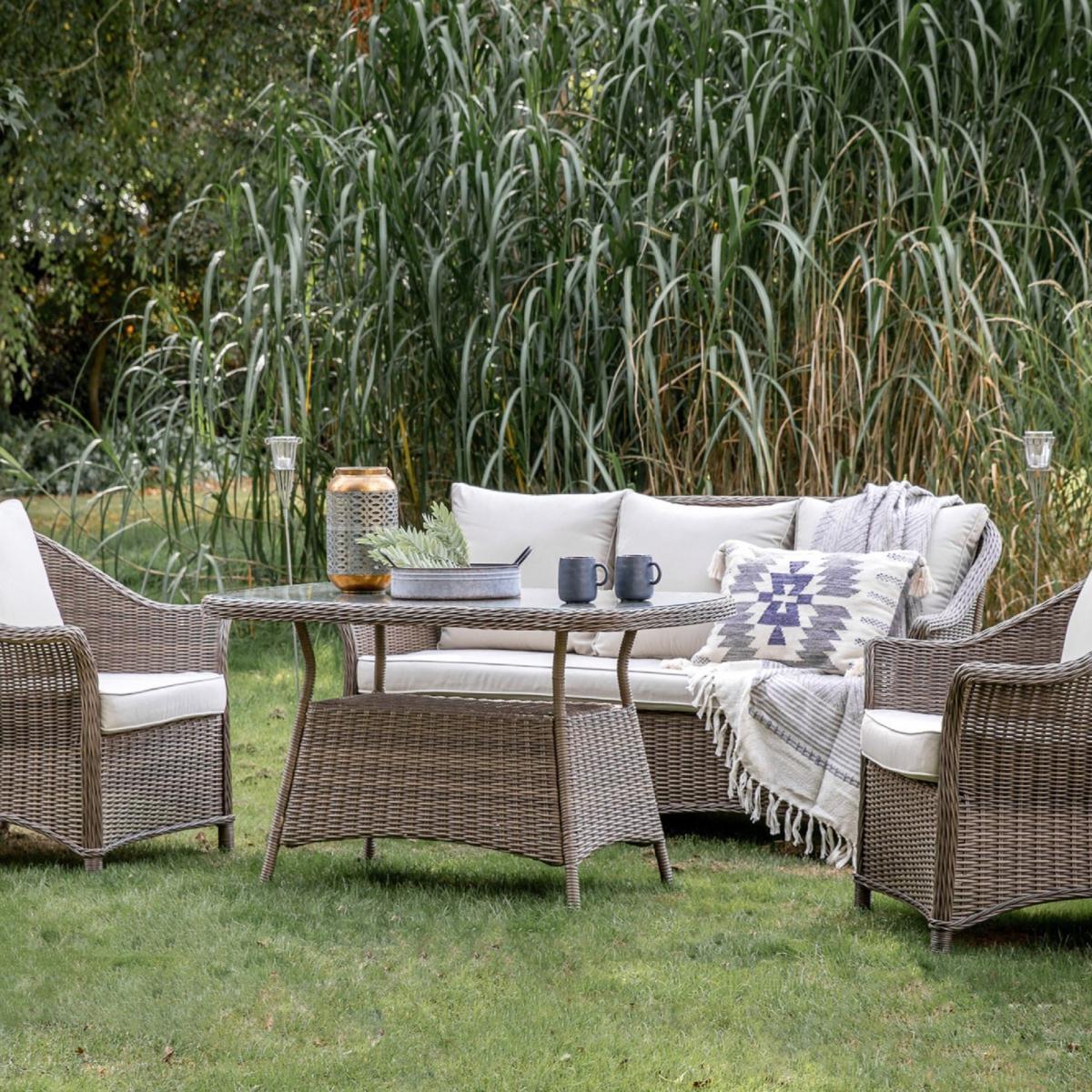 Designed with a unique rattan pattern, this contemporary Granville Rounded Country Dining Set will give your outdoor space an uplift this summer. Removable showerproof cushions are included with the set and the set is weather resistant. The glass top table will be great for outdoor dining or drinking.