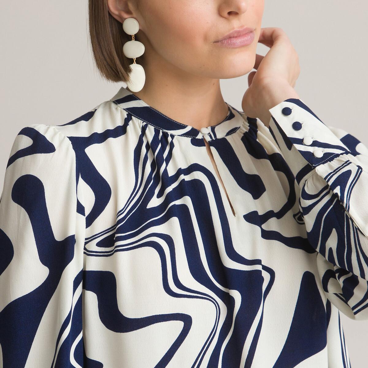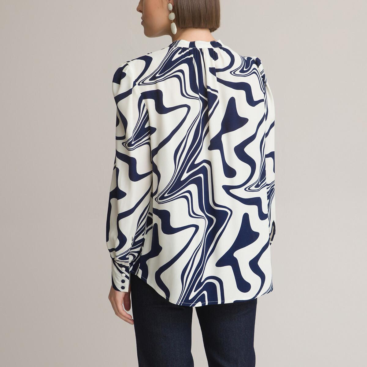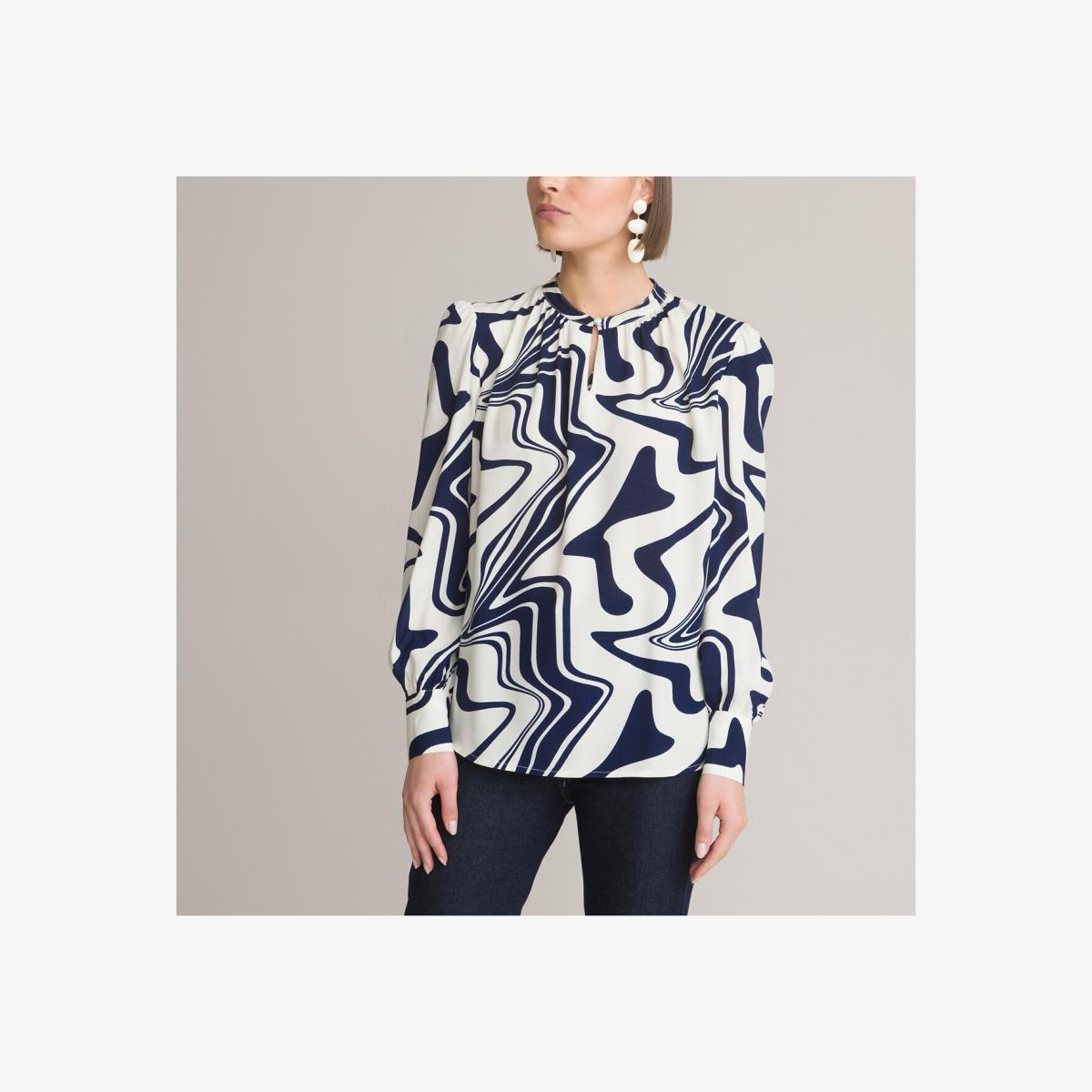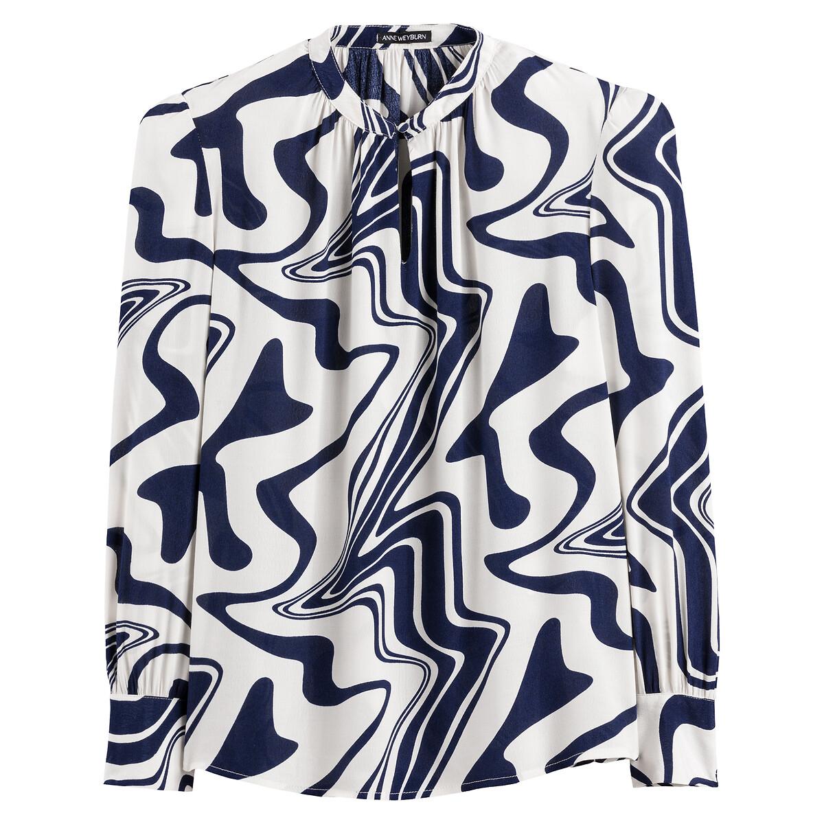 I love this blouse’s bold graphic print-it’s like wearing a piece of modern art that instantly adds personality to any look. It works well in interiors that embrace contemporary or eclectic styles, especially when paired with simple, neutral furnishings to let the print stand out. For styling tips, consider pairing it with tailored trousers or dark jeans for a balanced, polished look. It’s also versatile enough to be layered with a blazer or cardigan for more casual or professional settings. To enhance its artistic vibe, display it alongside abstract art or geometric accessories in your space-these subtle accents will tie the whole aesthetic together effortlessly.