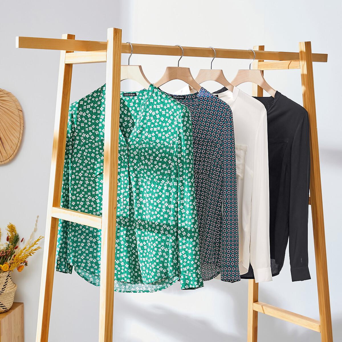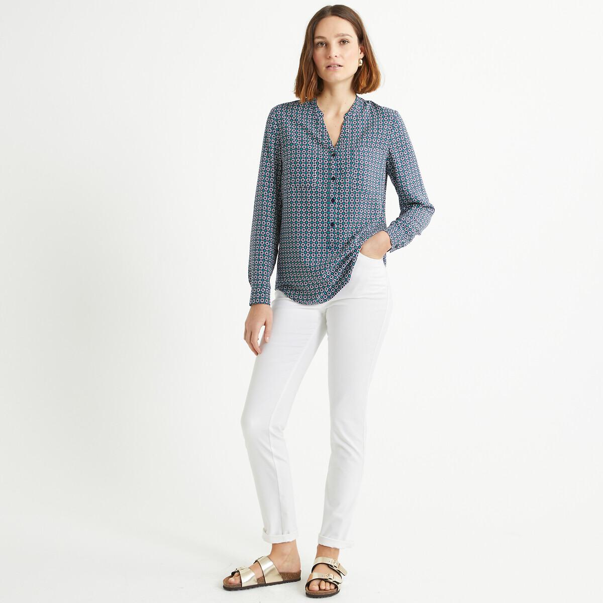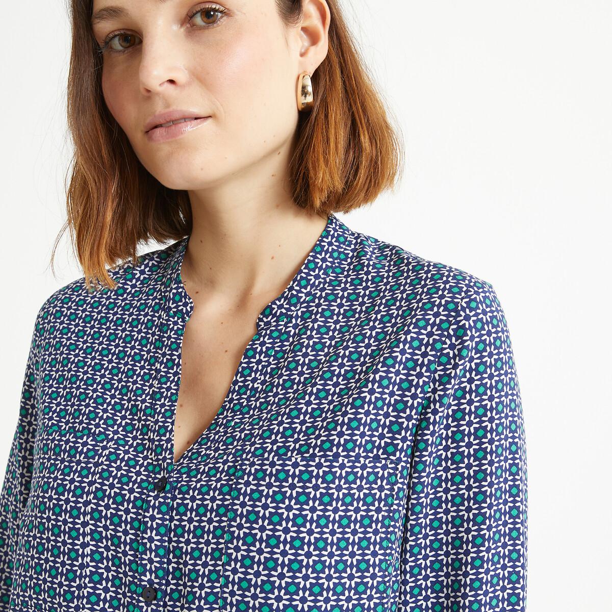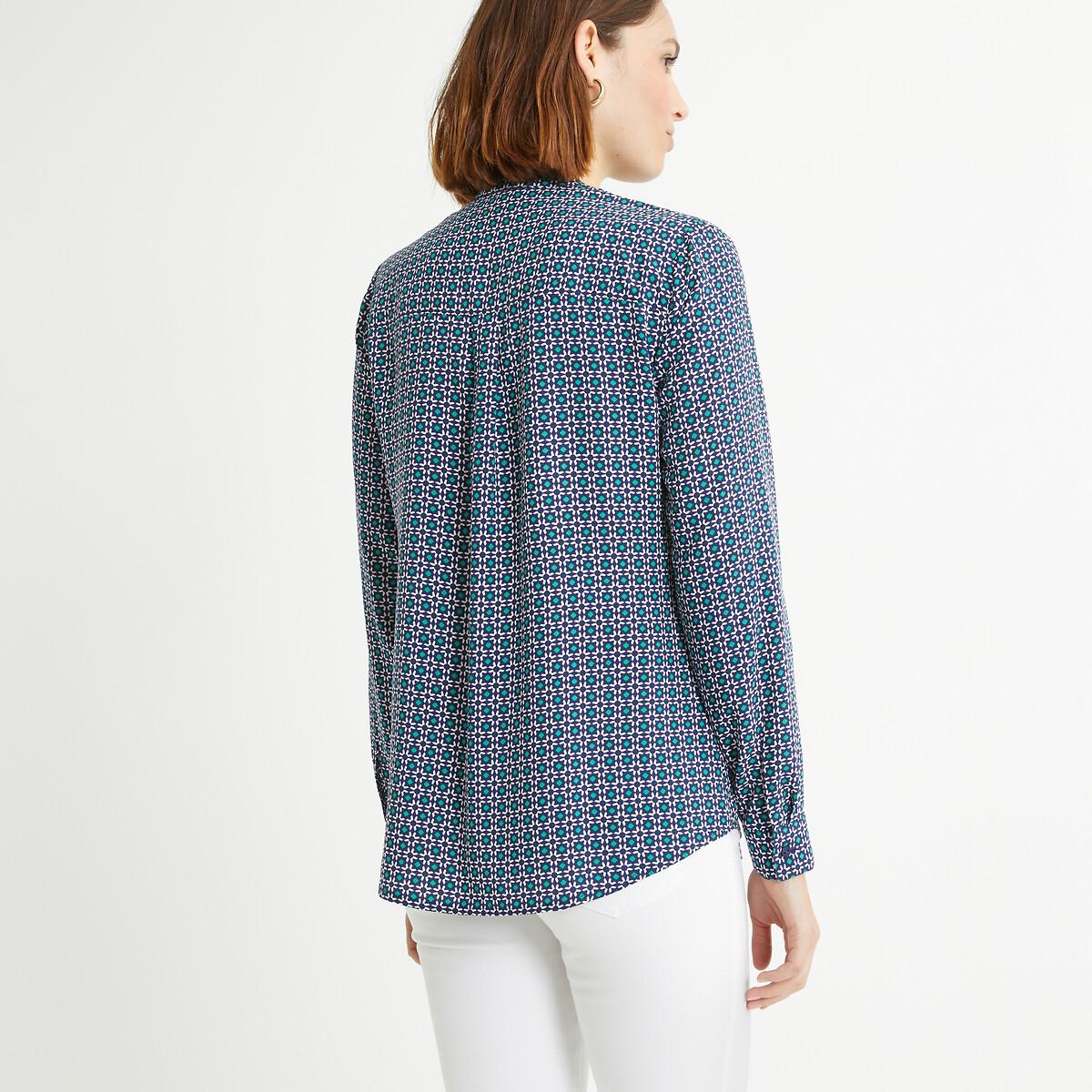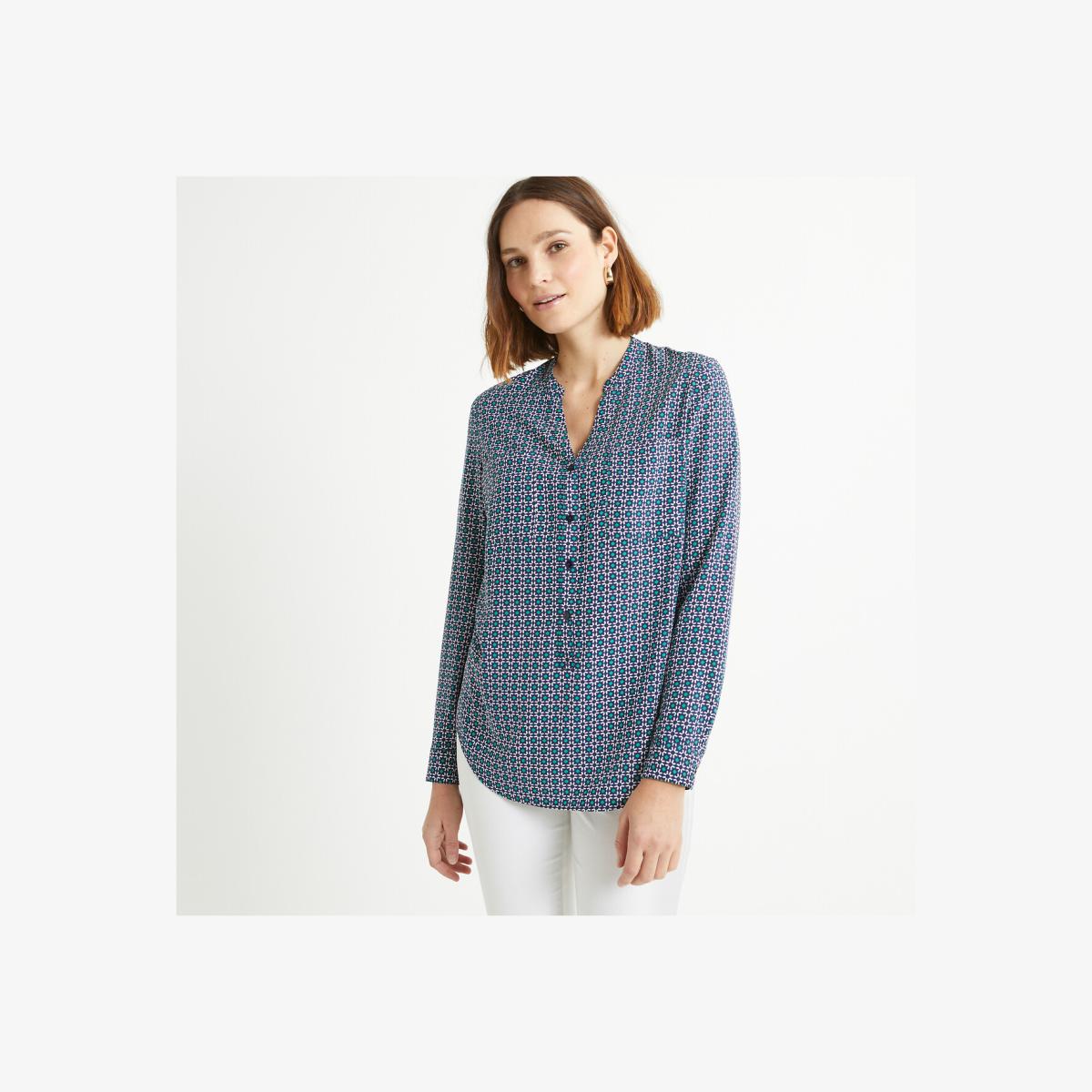 Printed blouse. Low grandad collar with buttoned placket. Wear tucked in or out. 2 patch breast pockets. Long sleeves. Bust darts. Back yoke. Product details • Long sleeves • Grandad collar • Graphic print. Product measurements for size 10/M • Length: 72cm • Sleeve length: 61cm • Chest: 102cm. Fabric content and care advice • 100% viscose • Machine washable at 30°C on a delicate cycle • Iron at low temperature • Do not bleach • Do not tumble dry • Do not dry clean • Textile sourced from sustainably managed forests. Lenzing™ Ecovero™ viscose fibres are textile fibres produced from FSC® or PEFC™-certified wood pulp derived from responsibly managed forests. Reforestation is achieved by replanting trees in these forests at a sustainable rate.