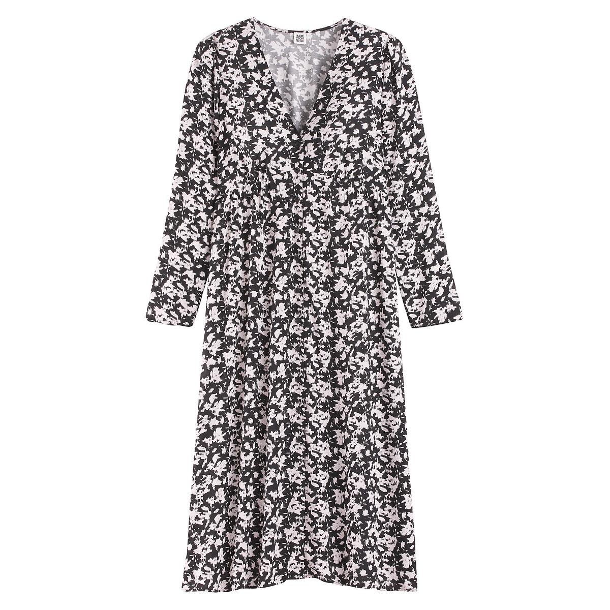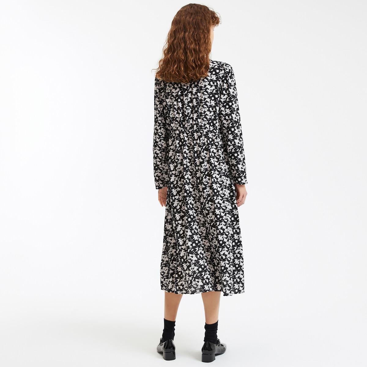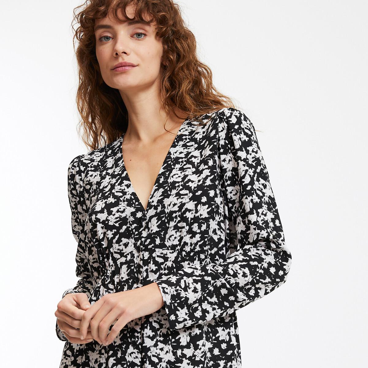 This printed dress features button fastening below the neckline, seaming under the bust, long sleeves and a v-neck. Gathered sleeve caps. Product details • Style: shift • Midi, 3/4 length • Long sleeves • V-neck • Graphic print Fabric content and care advice • 100% viscose • Machine washable at 30°C on a delicate cycle • Iron at a medium temperature • Do not bleach • Do not tumble dry • Do not dry clean