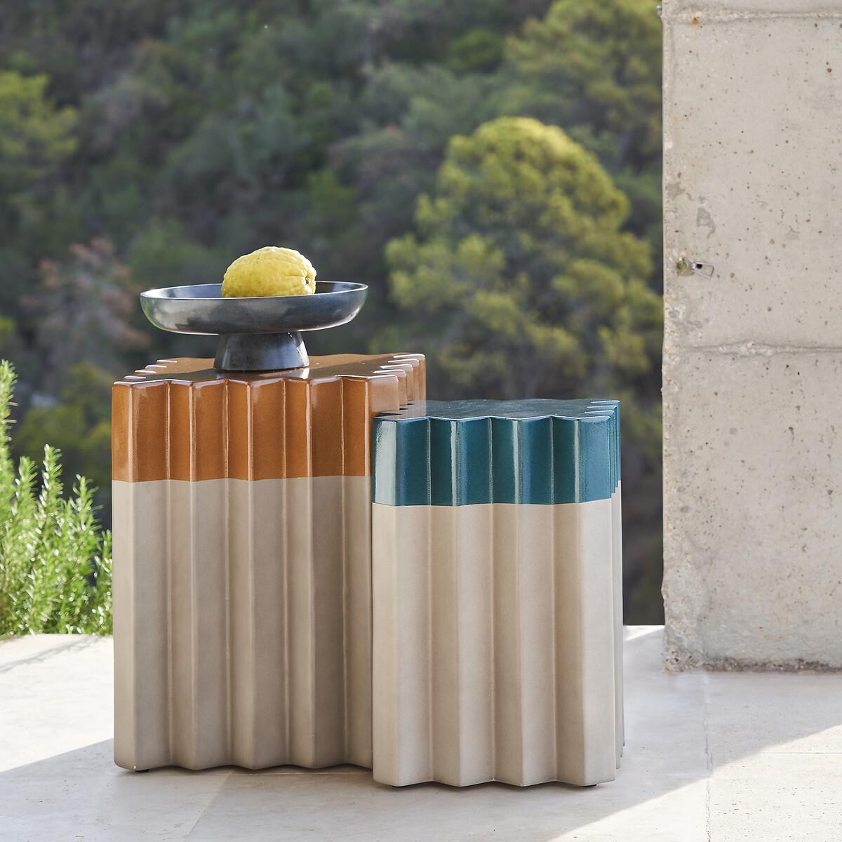 Furniture intended for the outdoors, Graphir can be placed on the terrace or by the pool. Its contemporary lines and intense colours make it an aesthetic and practical side table. Suitable for all climates, the Graphir end table is made of cement composite with an enamelled finish. The cut edge of each end of the sofa allows them to be nested together, thus creating a graphic collection. An AMPM creation. Product Details • GRC : composite of cement, fibreglass, resin and mineral powders • Enamelled finish. Quality Info • Low temperatures are likely to affect the proper functioning and surface condition of your outdoor furniture. • We therefore advise you to store it in a dry, ventilated and closed room.. We strongly advise against the use of a tarpaulin, as it will act as an oven and damage the surface conditions; wood and metal products are particularly concerned. • Before any storage, remember to clean and dry the products well, in order to prevent the appearance of mould or unpleasant odours.. • In any case and regardless of the material, it is not recommended to leave the furniture outside without protection, particularly during bad weather and the winter phase.. Dimensions • Width: 38cm • Height: 51cm • Depth: 38cmDelivery:. Sold pre-assembled. Note! Please check that all access points are large enough to accommodate your delivery (doors, stairs, lifts).Dimensions and weight of parcel1 parcel • L48 x H61 x D48cm, 32kg