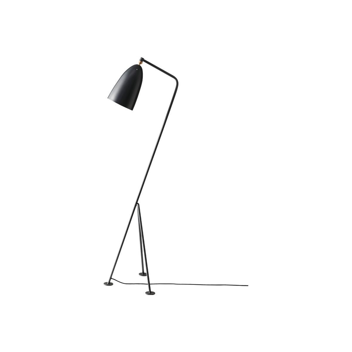 The unmistakable silhouette of Gretta Grossman's anthracite grey Gräshoppa Floor Lamp for Gubi ensures it remains an icon of mid-twentieth century design. The unique form of the Gräshoppa Lamp resembles the insect it is named after as its tubular steel tripod base stands at an angle, giving the impression of a grasshopper stalking its prey. The lamp is finished with a conical shade crafted from powder-coated steel and accented with a rotating brass fitting that allows you to create targeted lighting with minimum glare. Created in 1947 by the Swedish-born and California-based designer, the lamp is heavily influenced by European modernism. Inspired by designers such as Ludwig Mies van der Rohe and Walter Gropius, Grossman herself was a pioneer in shaping the aesthetic of mid-century North American modernism. Requires: 1 x Max 4.6W E14 LED Bulb (not included)