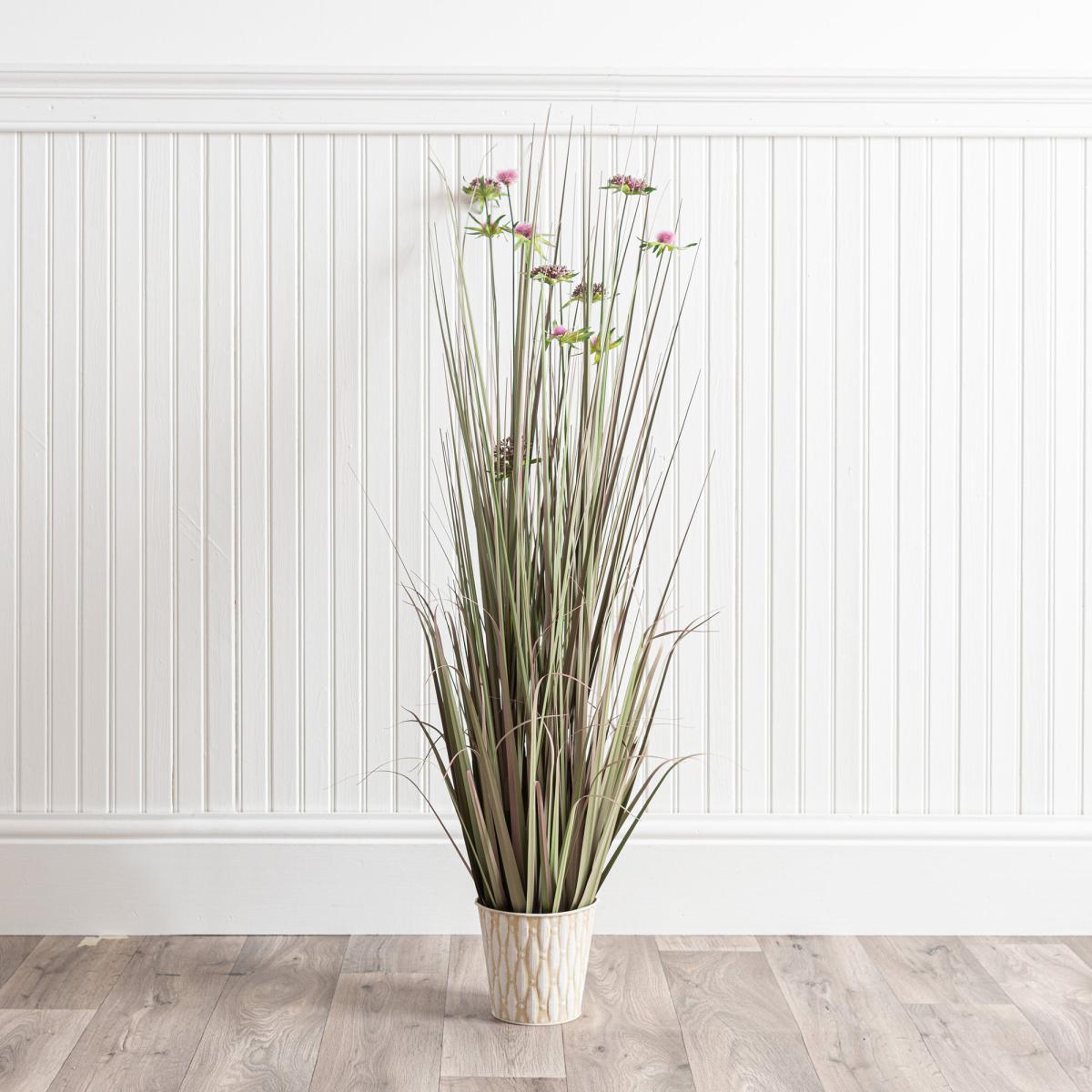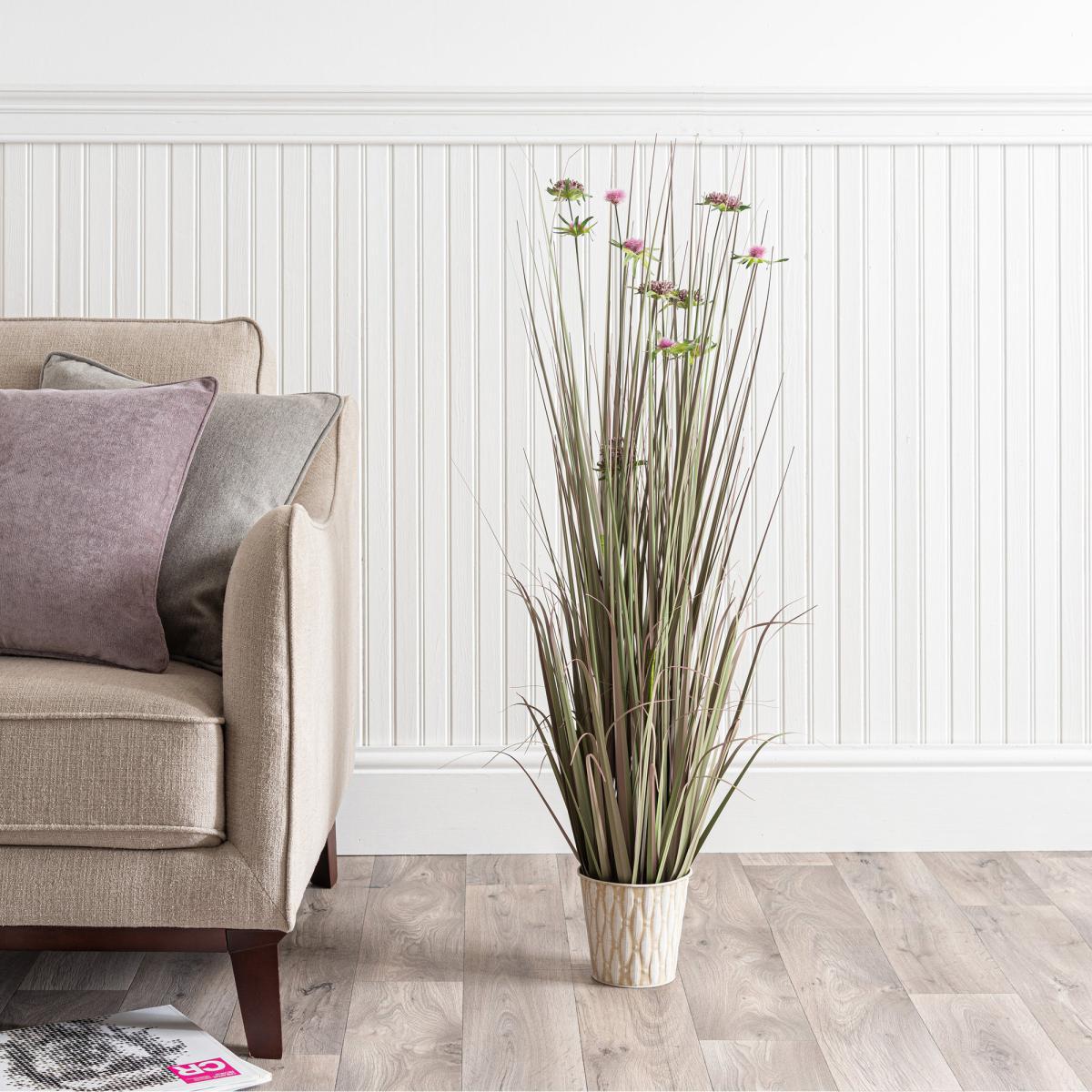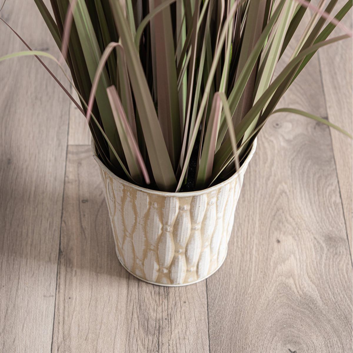 Ideal for display in any room of the house, this beautiful tall flowering grass is set in a painted metal pot, featuring soft purple flowers and a complementing pink shade to the grass. The painted metal pot has a white wash and features a textured pattern, giving a stylish look to the piece.