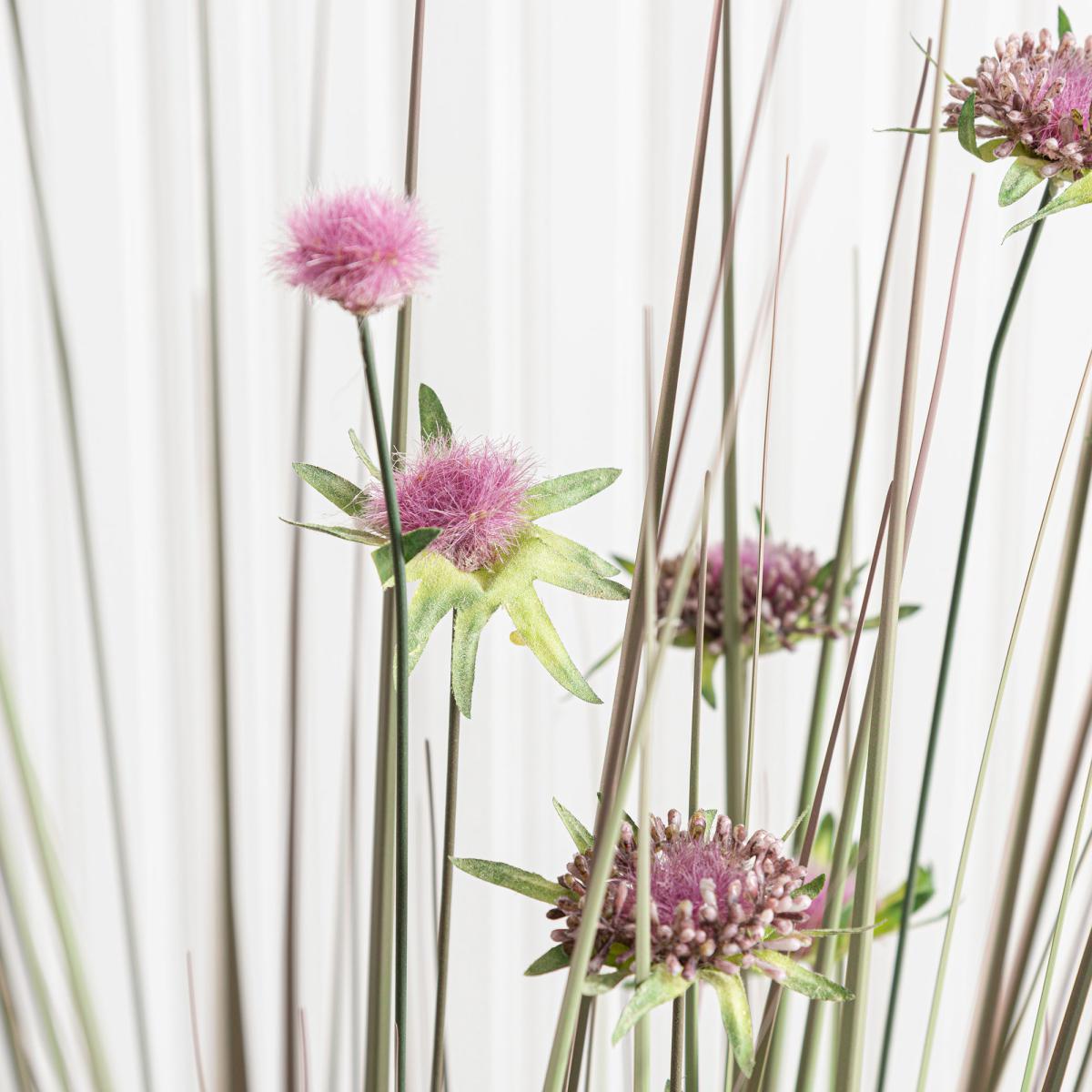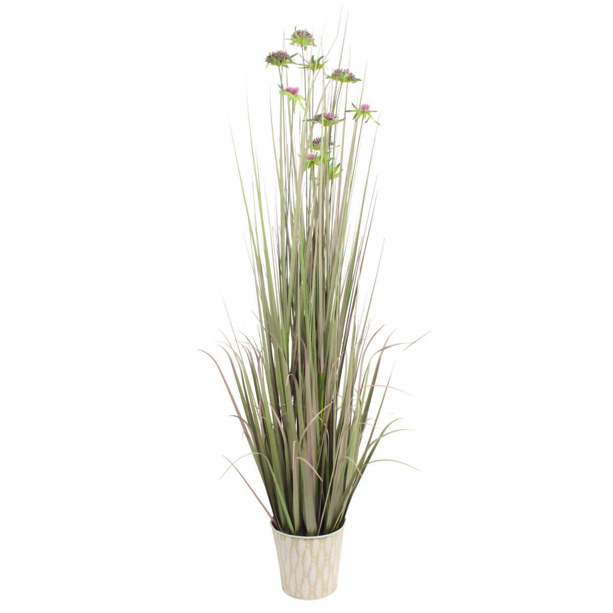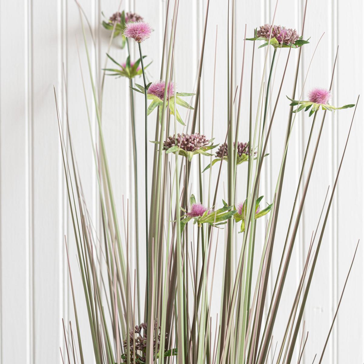 Ideal for display in any room of the house, this beautiful tall flowering grass is set in a painted metal pot, featuring soft purple flowers and a complementing pink shade to the grass. The painted metal pot has a white wash and features a textured pattern, giving a stylish look to the piece.