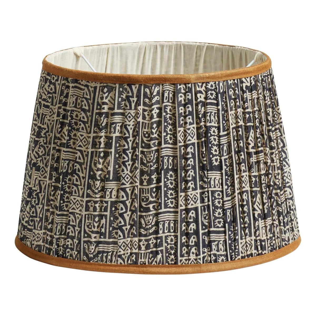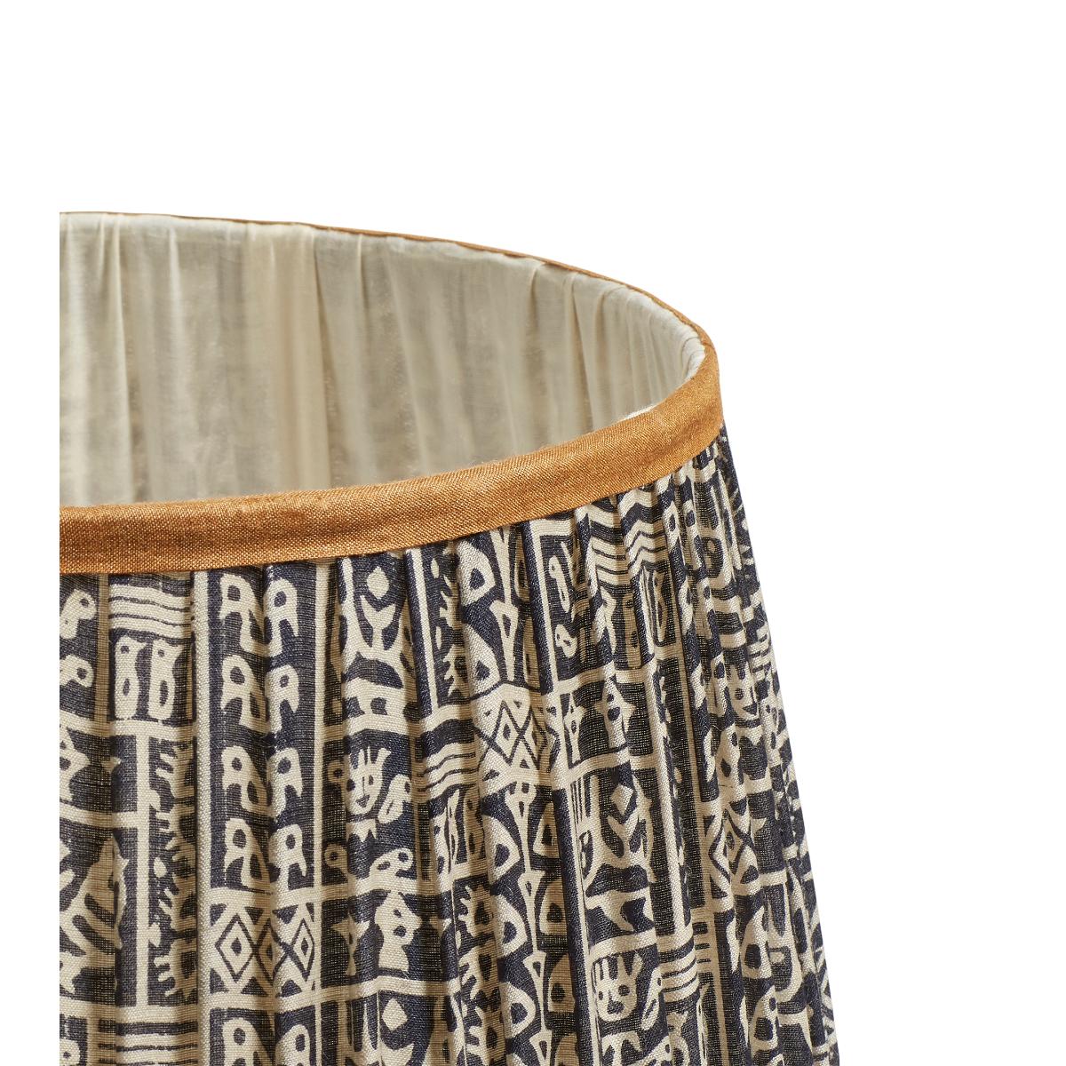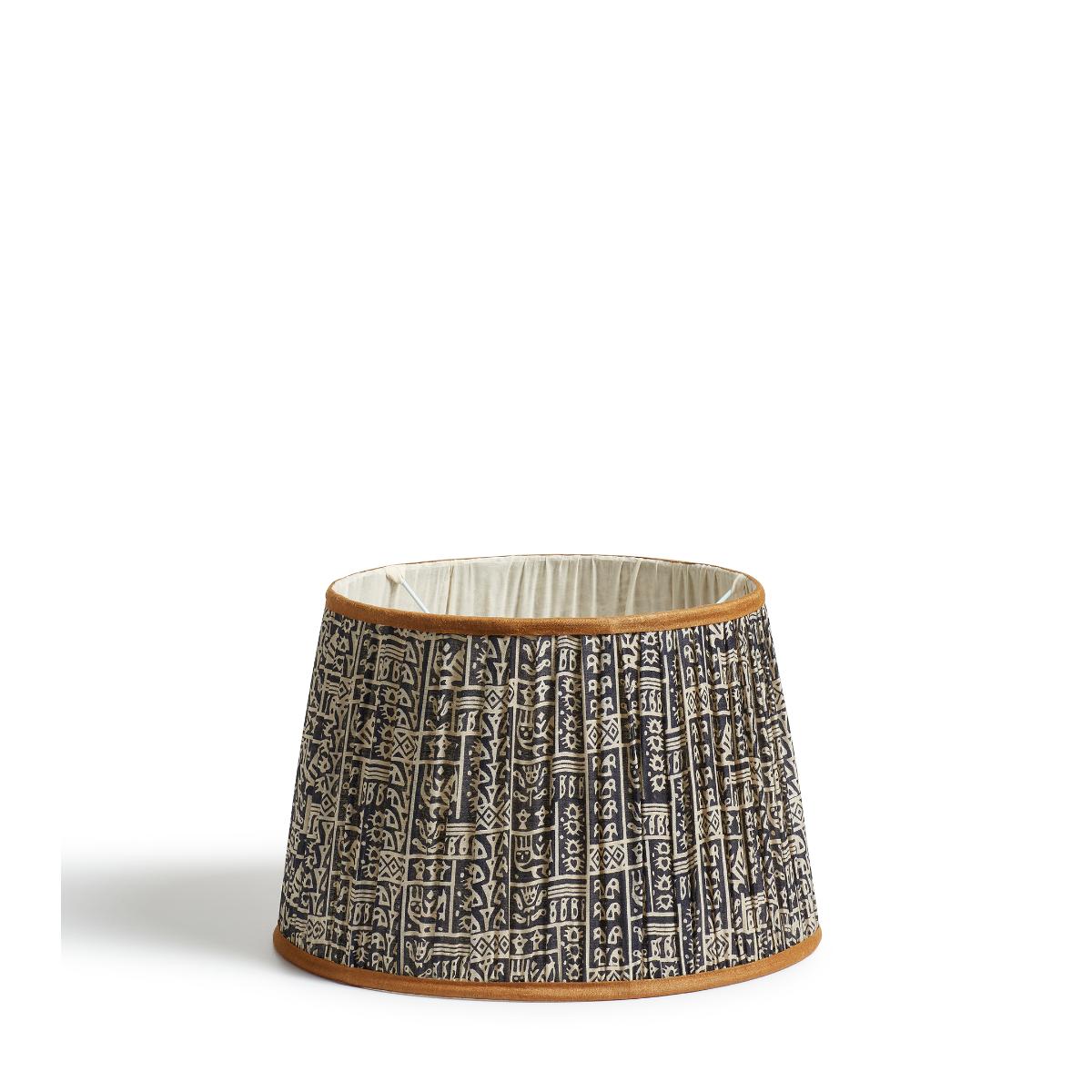 This bold range focuses on pattern. Its hieroglyph-style design is screen printed onto a natural tussar silk base. This indigo pattern is gathered by hand to form a pleated appearance and framed by the contrasting warmth of the ochre trim. The silk is hand stitched onto its metal frame and lined with cotton. This is the smaller of two sizes, which sits perfectly on more petite lamp bases.