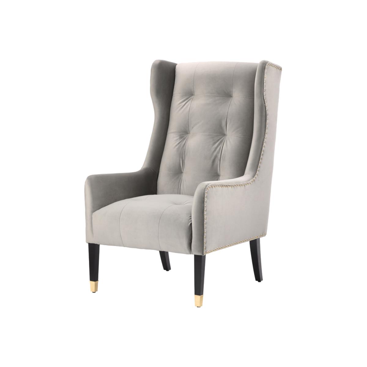 A unique statement armchair with characterful winged back. Ergonomic design with headrest and lumbar support. Comfortable seat with deep foam and no-sag spring construction. Deep quilting with blind buttoning. Brushed brass studs and feet caps. Velvet upholstery fabric.