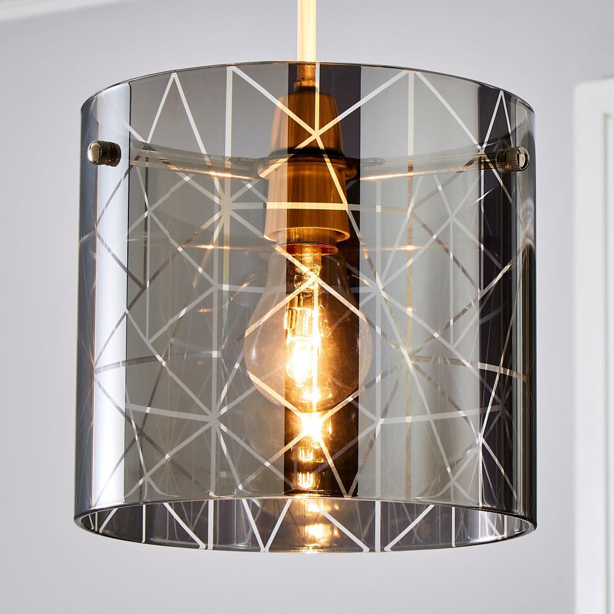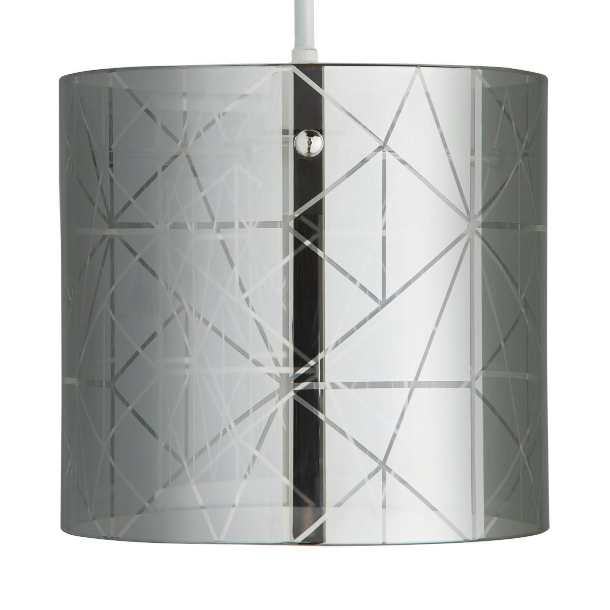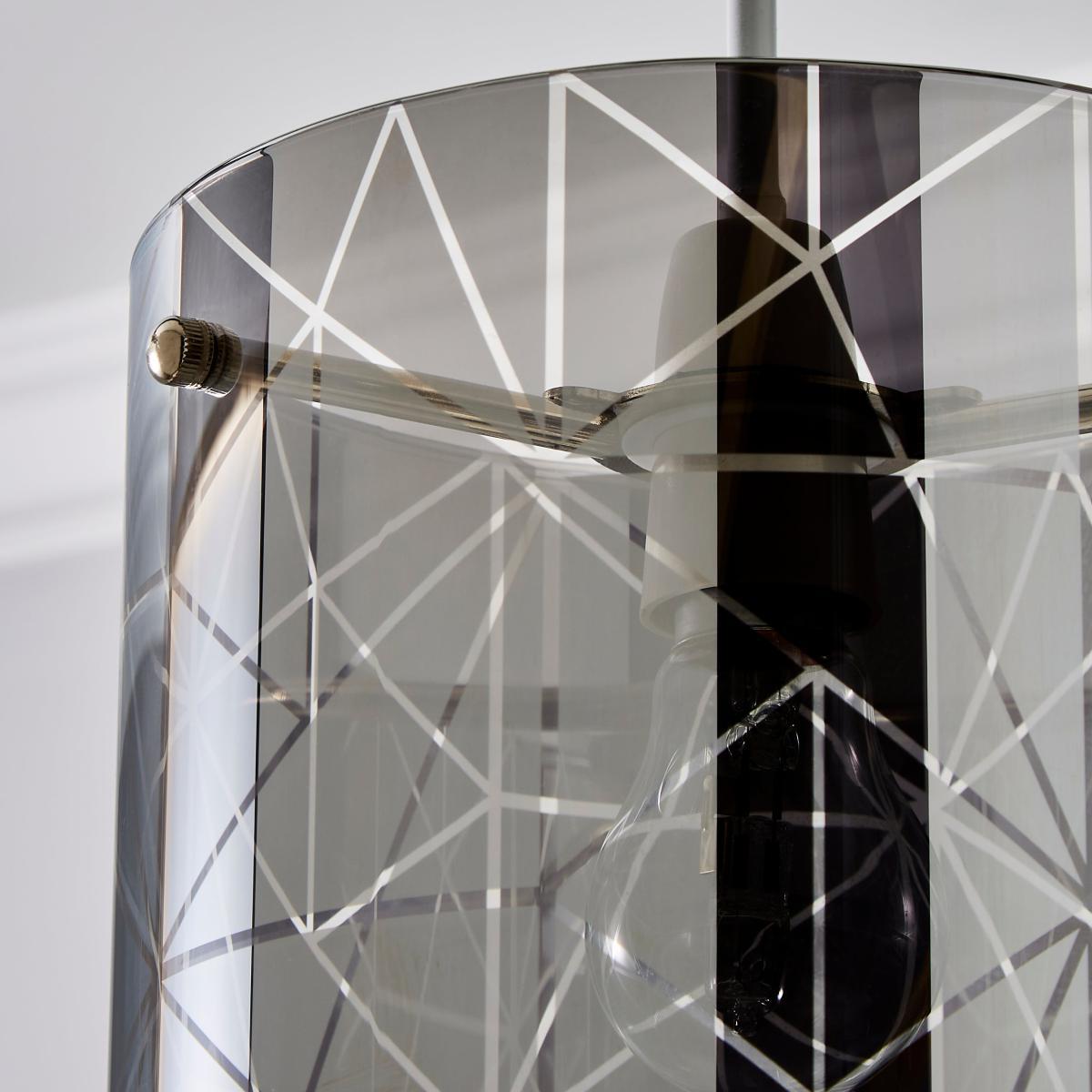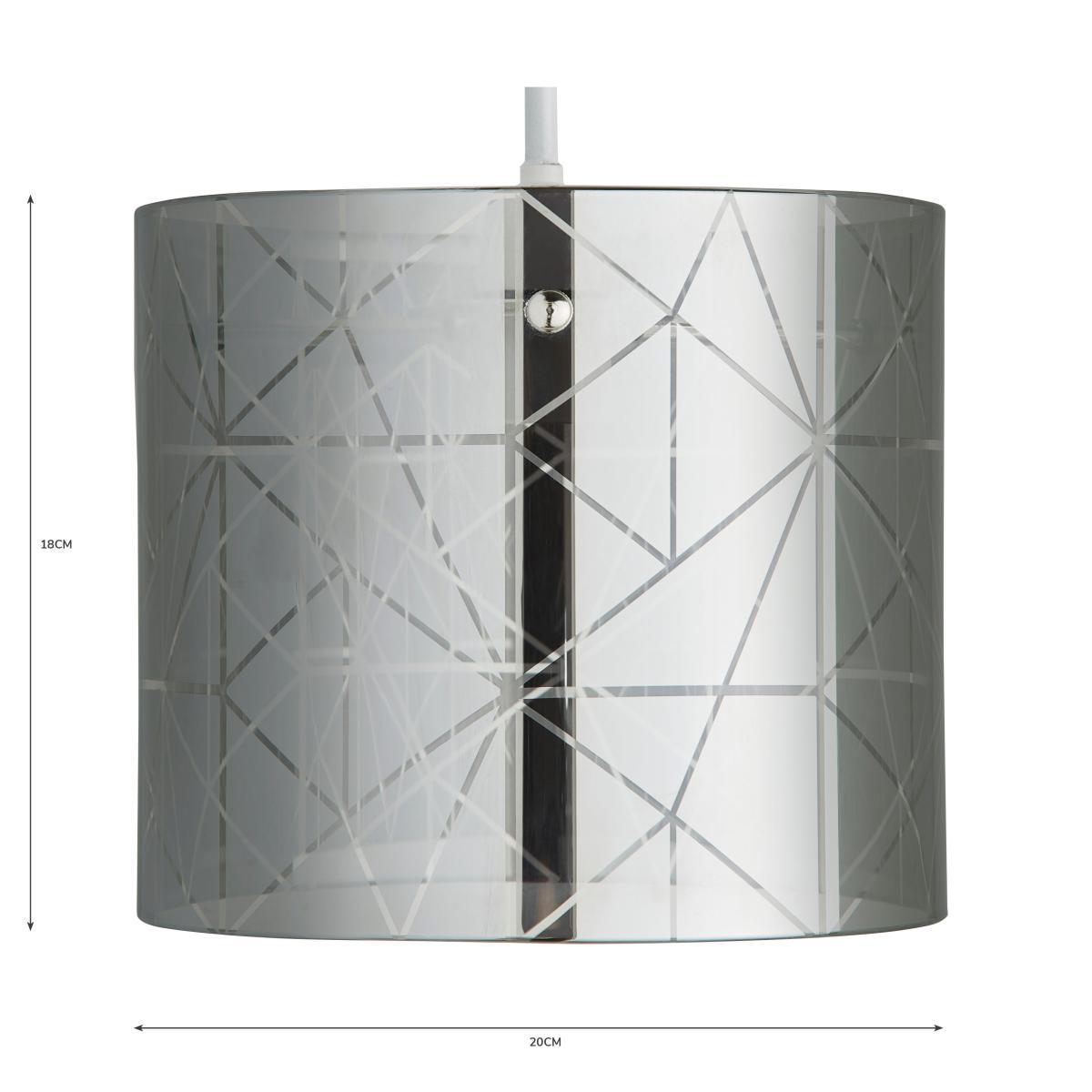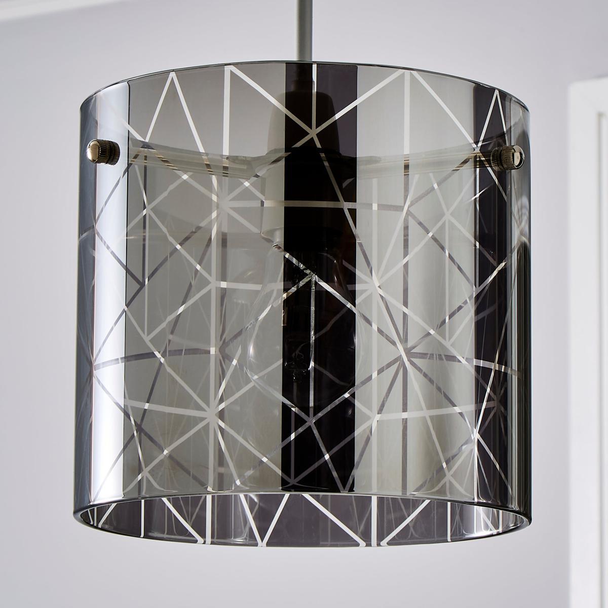 The Grayson Large Easy Fit Pendant is crafted from a stylish smoked glass, featuring a modern cylindrical design that would add a contemporary touch to any room. This modern glass shade also features chrome metal details and a stylish frosted etched finish, perfect for adding a luxurious touch to your room.