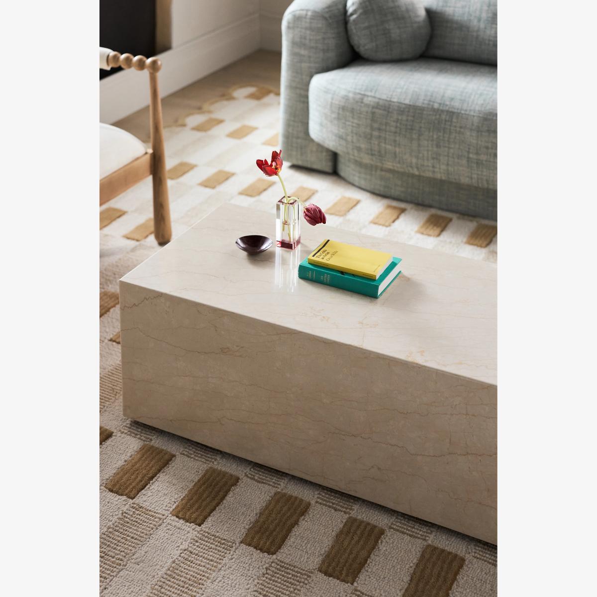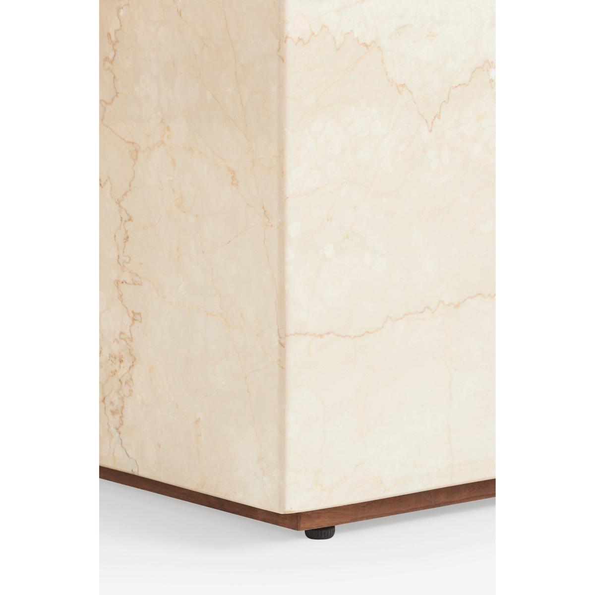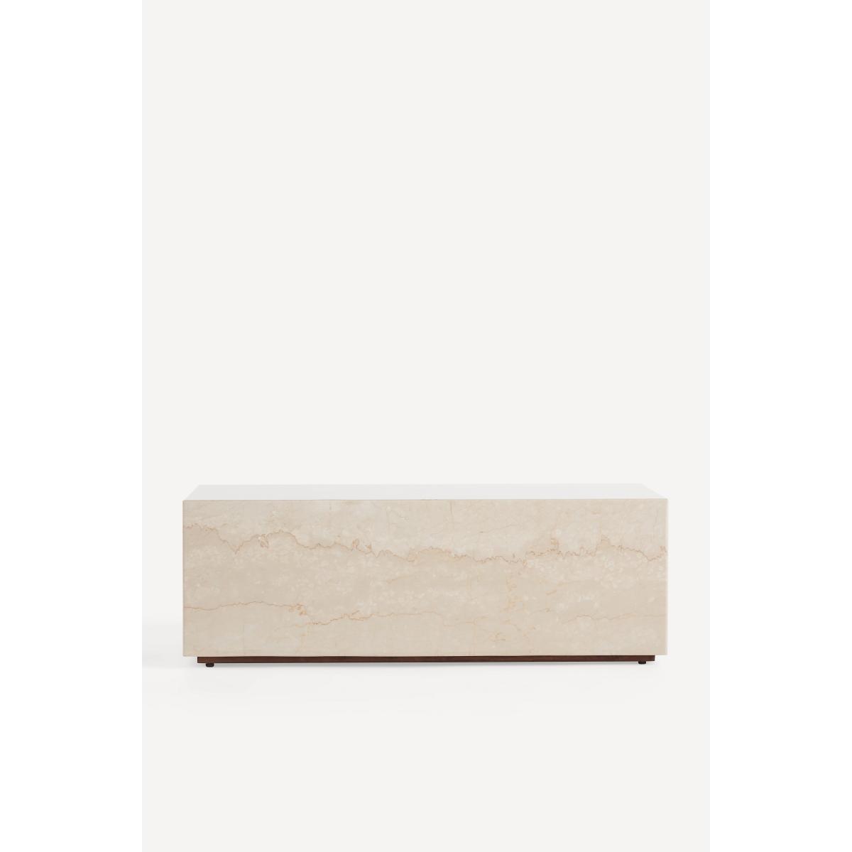 Marble coffee table with reinforced with tropical and engineered hardwood. Address spills immediately with a dry, soft cloth. Natural stone is a porous material, and although it has been sealed, spills should be blotted promptly to minimize staining. Use trivets, coasters, placemats, and felt pads to help prevent scratches. Sealed with clear lacquer for protection. Imported