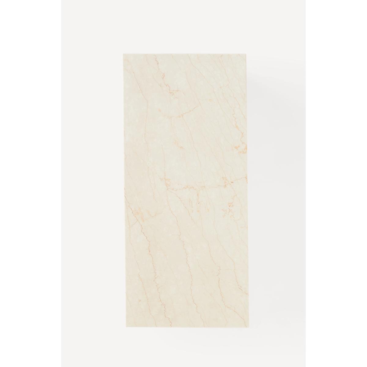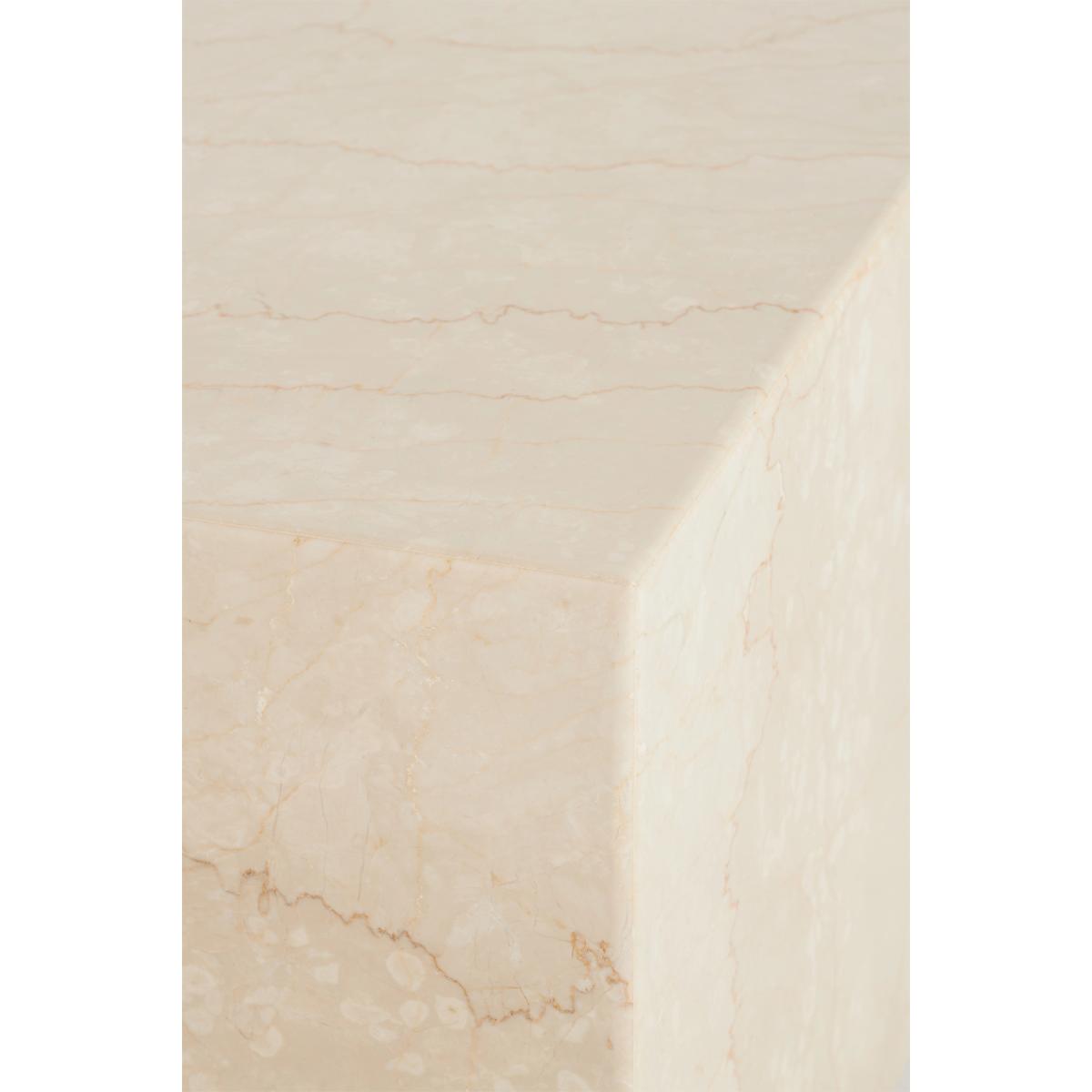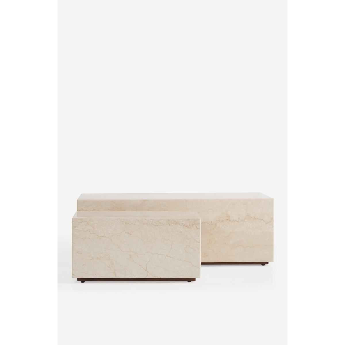 Marble coffee table with reinforced with tropical and engineered hardwood. Address spills immediately with a dry, soft cloth. Natural stone is a porous material, and although it has been sealed, spills should be blotted promptly to minimize staining. Use trivets, coasters, placemats, and felt pads to help prevent scratches. Sealed with clear lacquer for protection. Imported