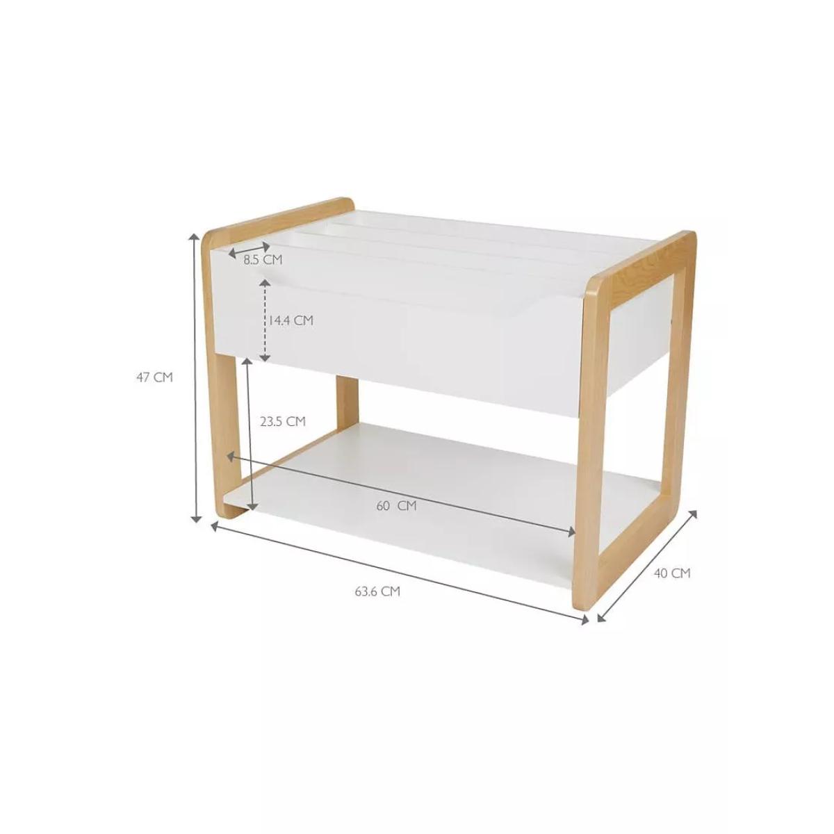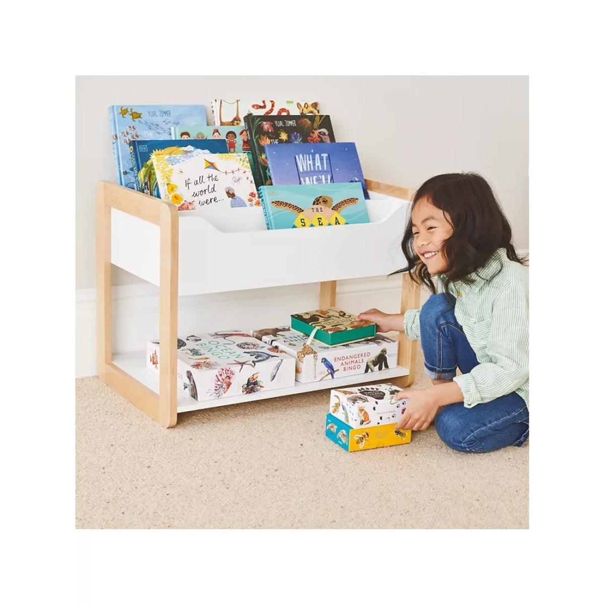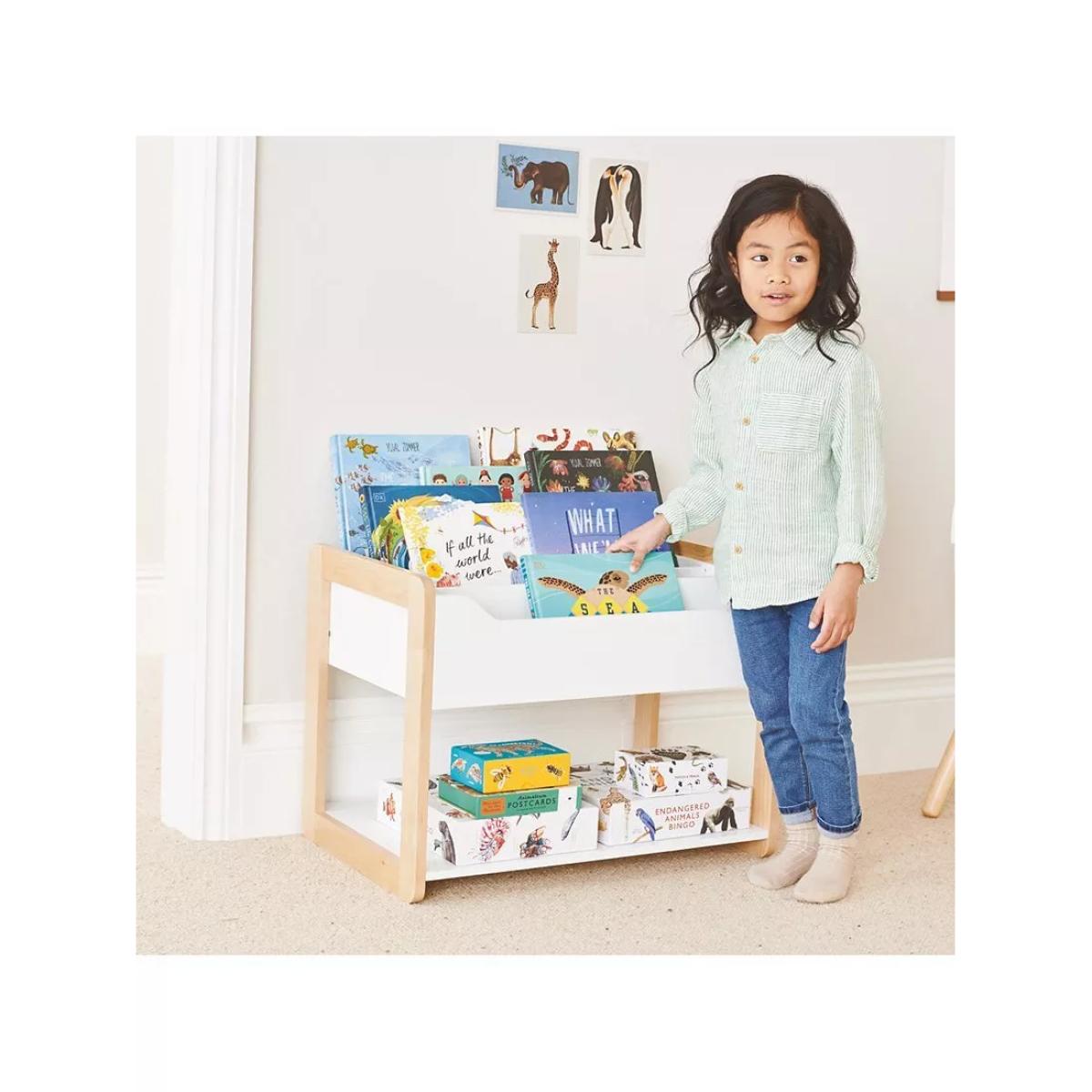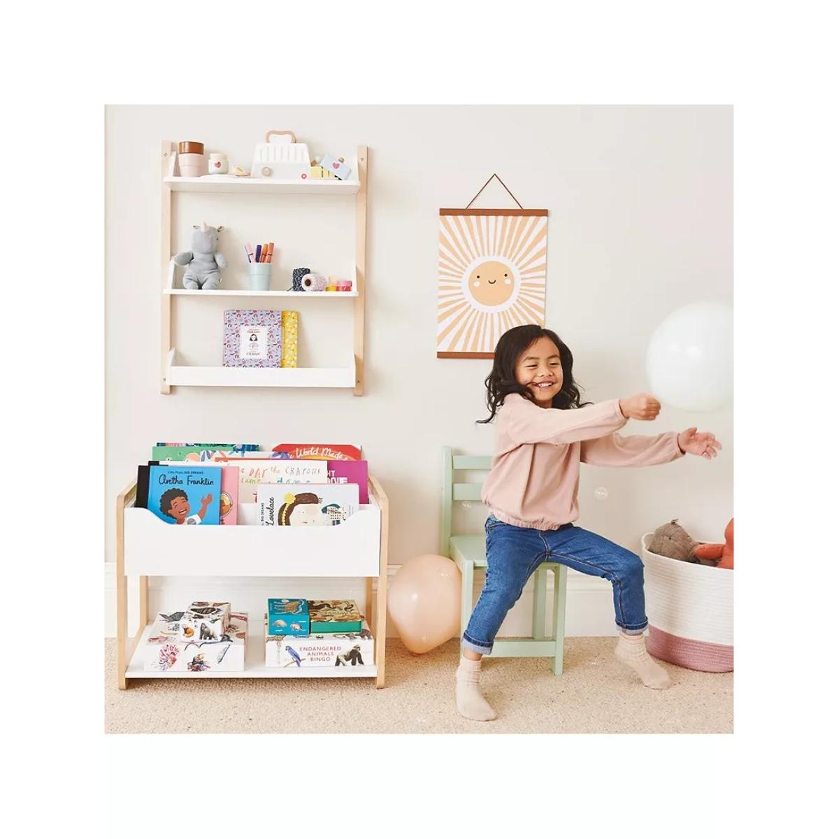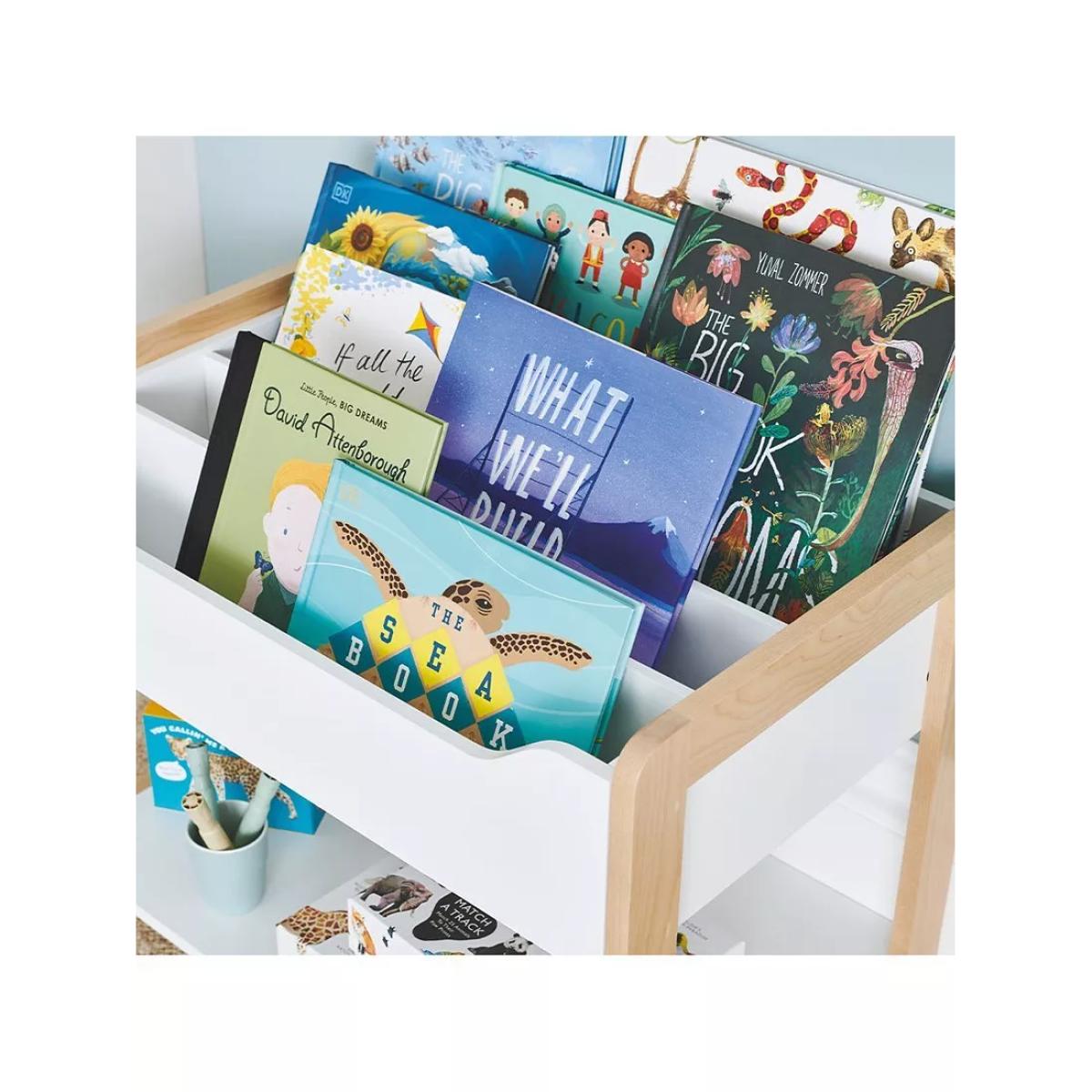 I’m a big fan of this little Beanstalk bookcase for its clean lines, natural beech frame and matt-white storage tray - it slots effortlessly into Scandi-inspired nurseries, modern playrooms or even a minimal living space. Its low height encourages toddlers to pick and return books independently, while the open-fronted tray keeps titles on display and easy to reach. For practical styling, arrange books with their covers facing forward for a lively look, then balance heavier volumes or small toy baskets on the bottom shelf to ground the unit. Add a couple of soft-feeling fabric bins in complementary colours at the base for toy storage, and top it off with a simple wooden animal figurine or framed print to tie everything together without clutter.
