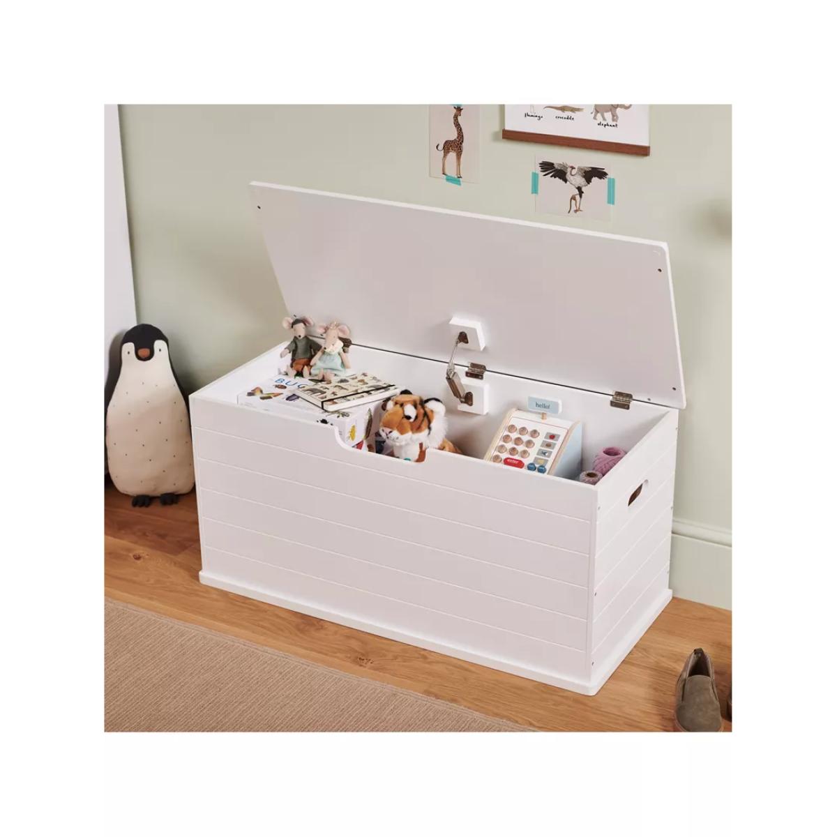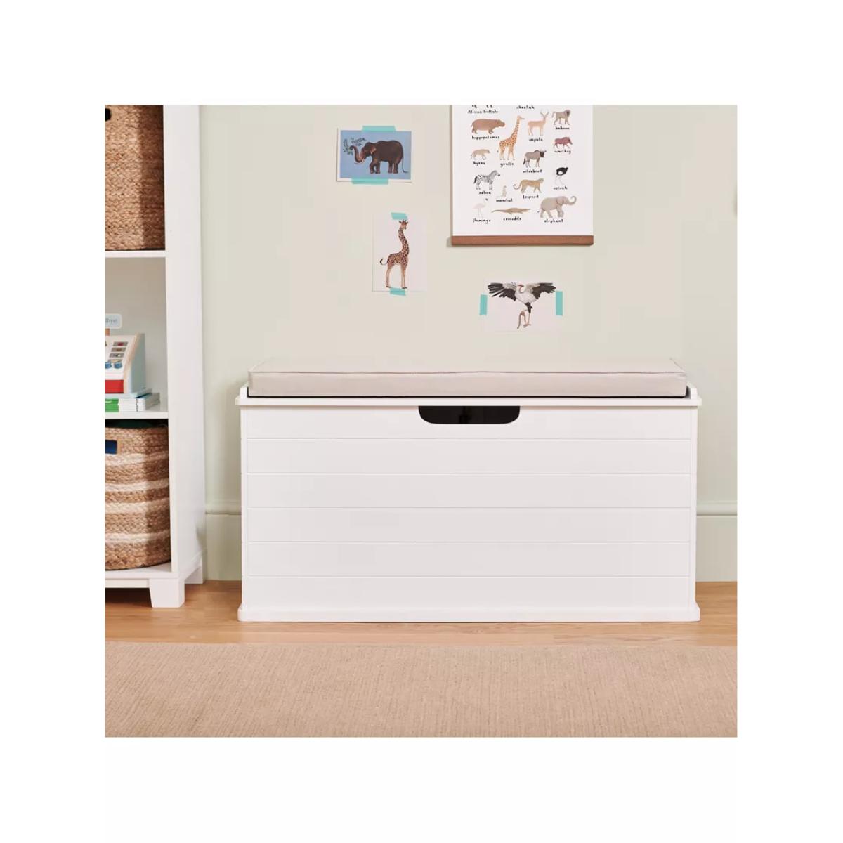 This large, classic toy box comes with plenty of storage space and doubles up as a handy seat too. It's super roomy, with a traditional tongue and groove detail and painted finish for a timeless look. Sturdy, safe and easy for children to use, there's a safety hinge on the lid and cut-out handles making it easy to move around. The neutral shade cushion cover is made from 100% cotton, and as an added bonus, it's machine washable too.