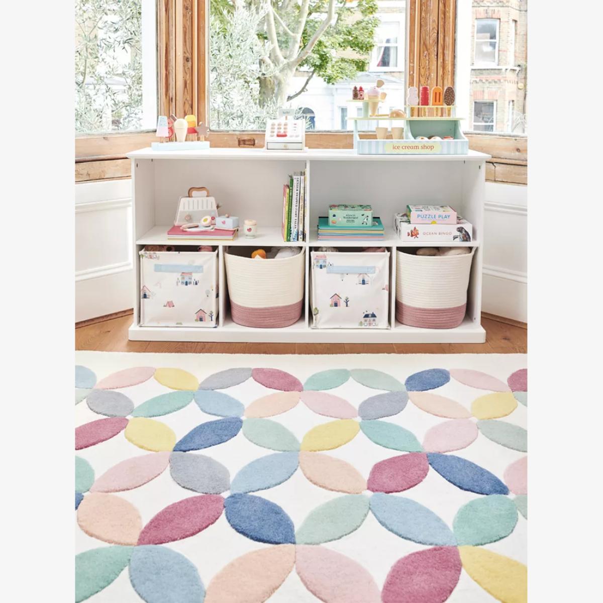 I’m a big fan of the Kaleidoscope rug for kids’ rooms because its soft geometric pattern brings colour without overwhelming the space. The mix of muted pastels works well in Scandi-style nurseries or modern playrooms where you want a fun focal point but still a calm backdrop. Styling tips: place a non-slip underlay for safety, then layer it under a low storage unit or reading nook to define the play area. Match one of the rug’s colours in cushions or wall hooks to tie the look together. Regular vacuuming keeps the pile looking fresh, and its flat-weave design means it’s easy to roll up when you need extra floor space.