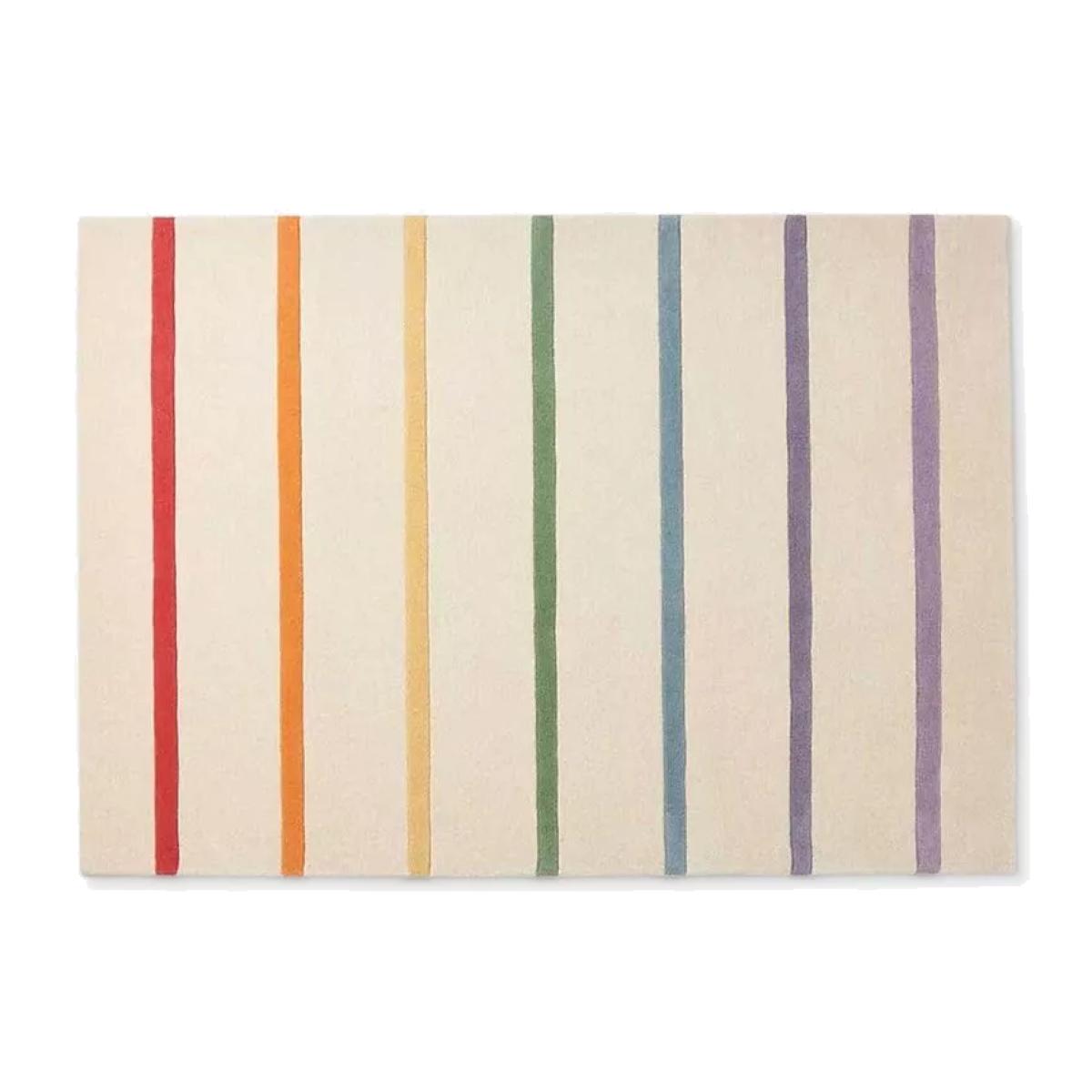 I’m a big fan of this rainbow-stripe rug for a child’s room because it brings in just enough colour without overwhelming the space. The muted stripes sit beautifully on a neutral floor and work equally well in Scandi-inspired nurseries or more eclectic playrooms. For practical styling, place it under a reading nook or play table to define the area, and pair it with simple, solid-coloured cushions and storage baskets to let the stripes pop. It’s easy to clean, hardwearing and light enough to move around as your little one’s room evolves.