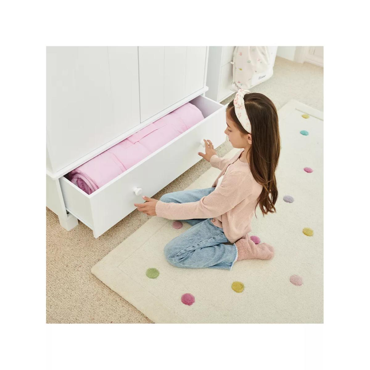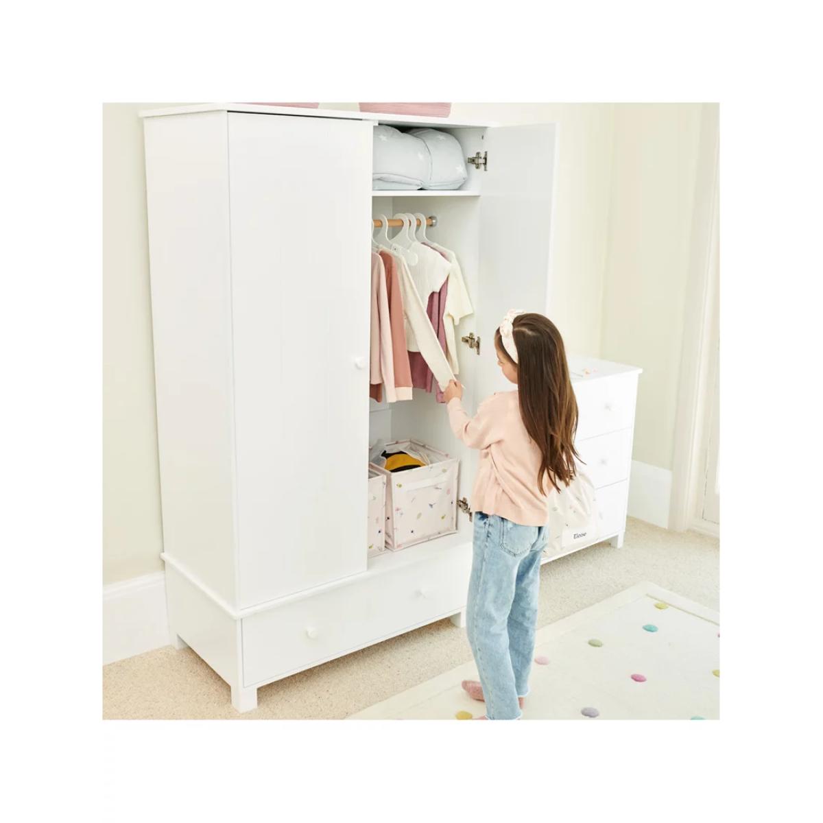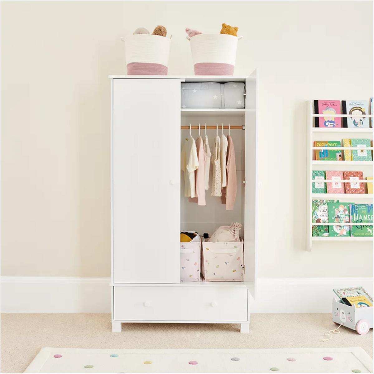 I love this little wardrobe for its clean, versatile design that blends seamlessly into both modern and classic kids’ rooms. Its white finish keeps the space feeling light and fresh, making it a great choice for brightening up smaller rooms or serious nursery styles. Practical styling tips include adding some colourful baskets or organisational boxes inside for easy access to toys or accessories, while light hooks on the side can enhance storage without clutter. It works particularly well in neutral or pastel schemes, providing ample storage without overwhelming the space - perfect for creating a calm, clutter-free environment in a child’s room.