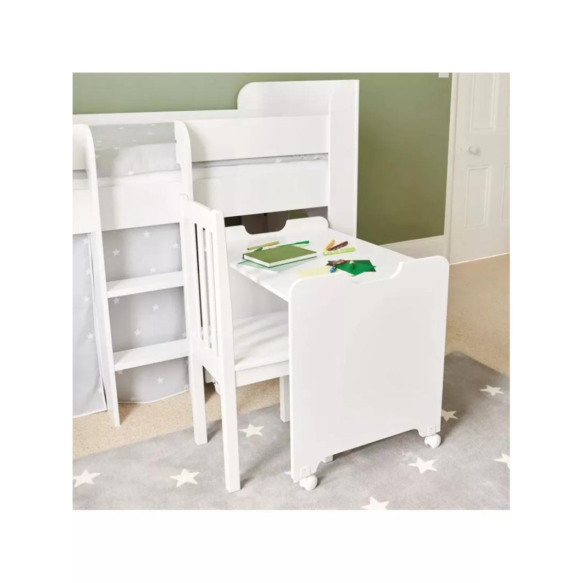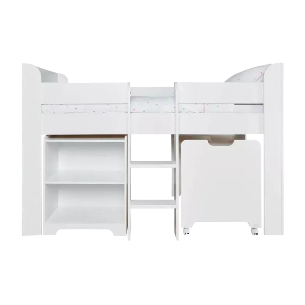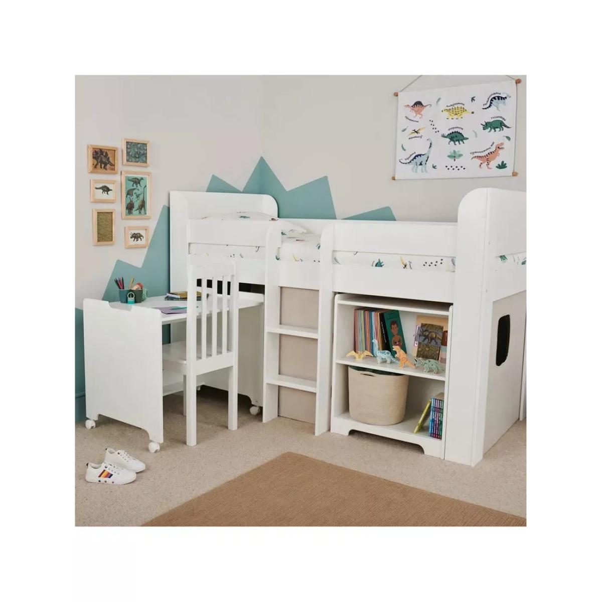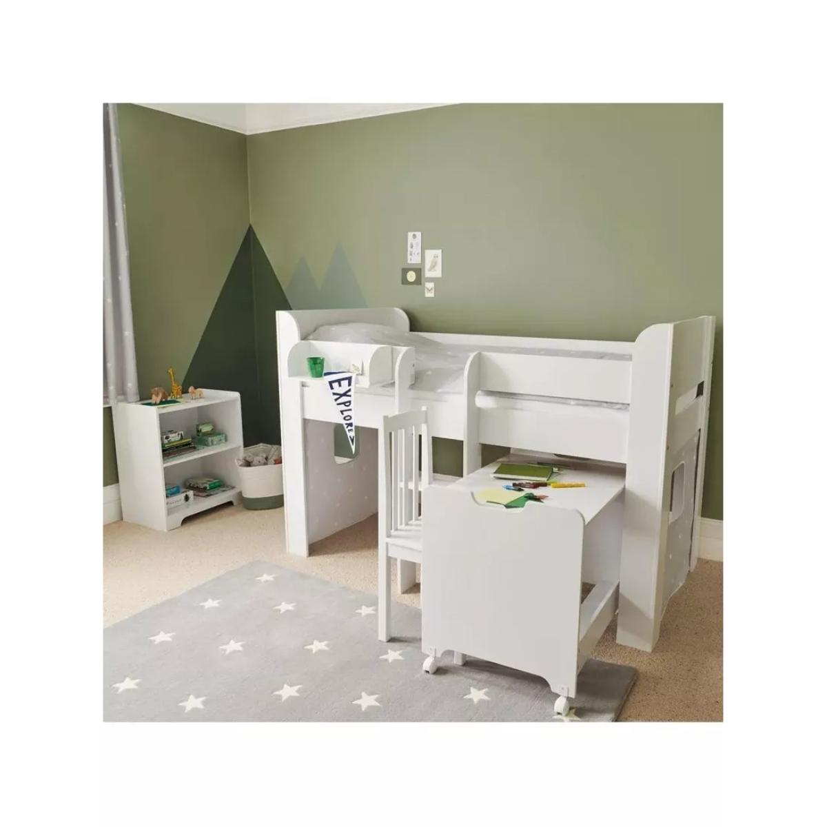 The Paddington Study Set is the perfect space-saving solution for your child’s bedroom, combining a mid-sleeper bed, pull-out desk, and storage shelf to maximise functionality in smaller spaces. Crafted from a durable painted solid wood frame with MDF panels and a sturdy pine slatted base, this bed ensures long-lasting reliability. The pull-out desk can be easily extended for study sessions and pushed back under the bed when not in use, freeing up valuable floor space. The built-in storage shelf is perfect for books, toys, or baskets, helping keep the room neat and organised. This mid sleeper requires a standard UK Single mattress with a shallower depth. The bed conforms to BS EN 747: 2012+A1:2015 standards, ensuring it meets stringent safety requirements.