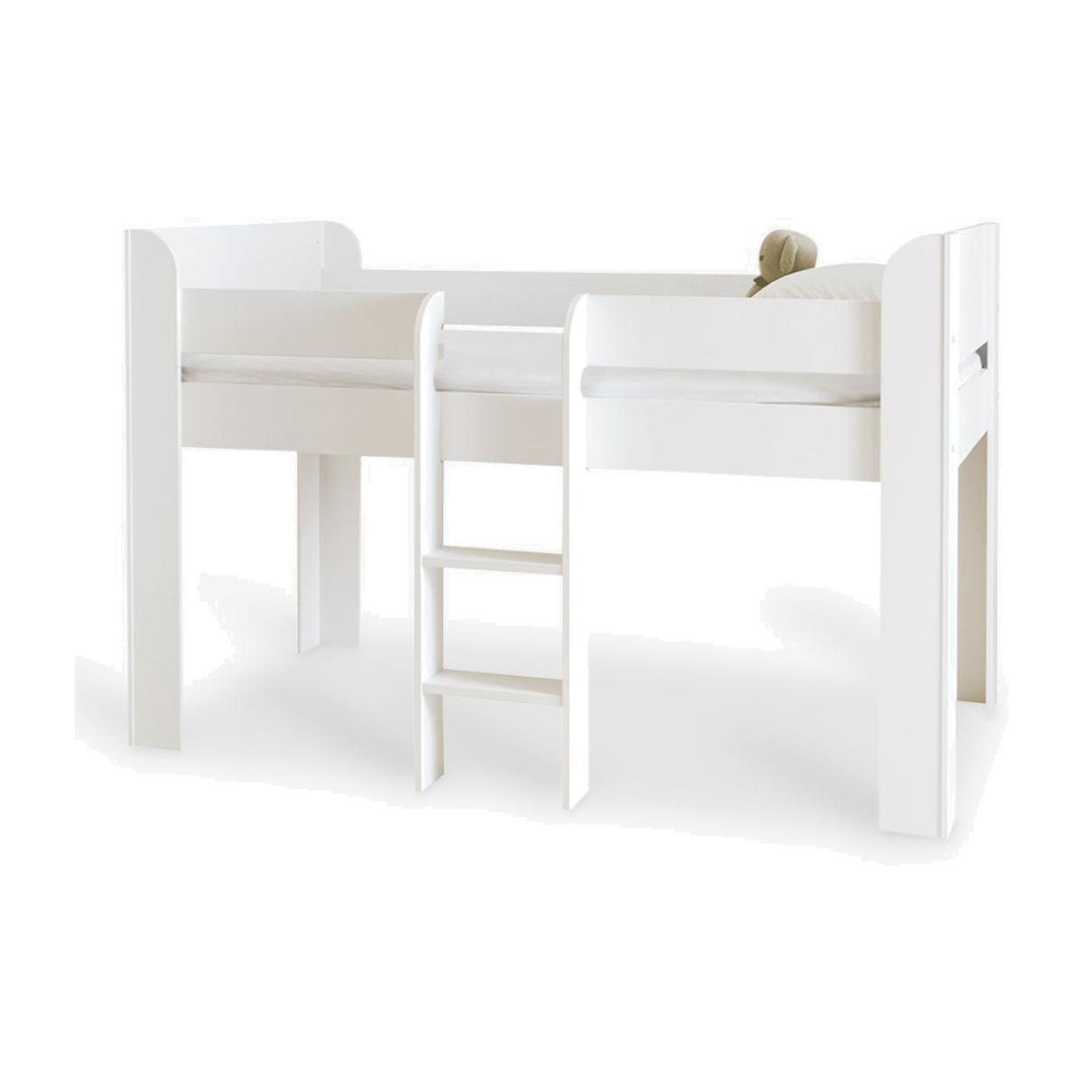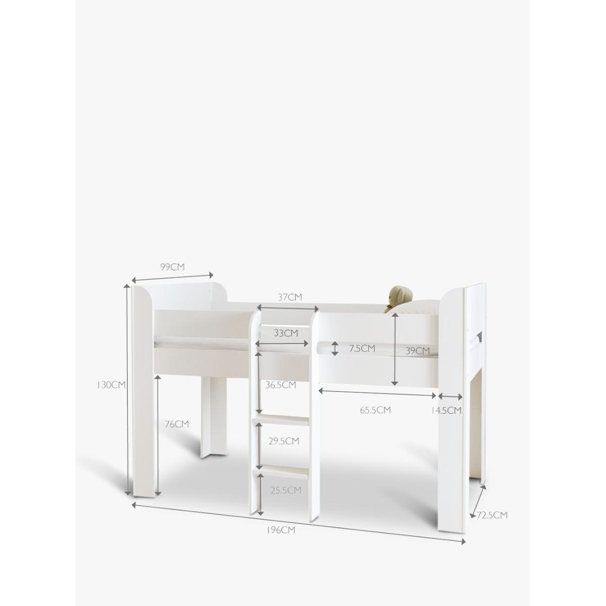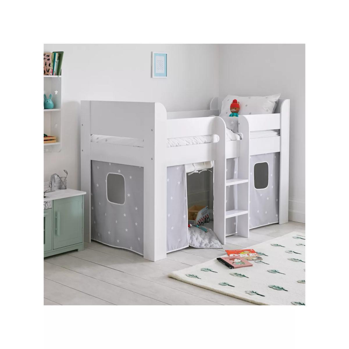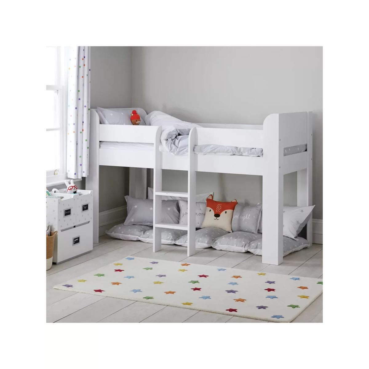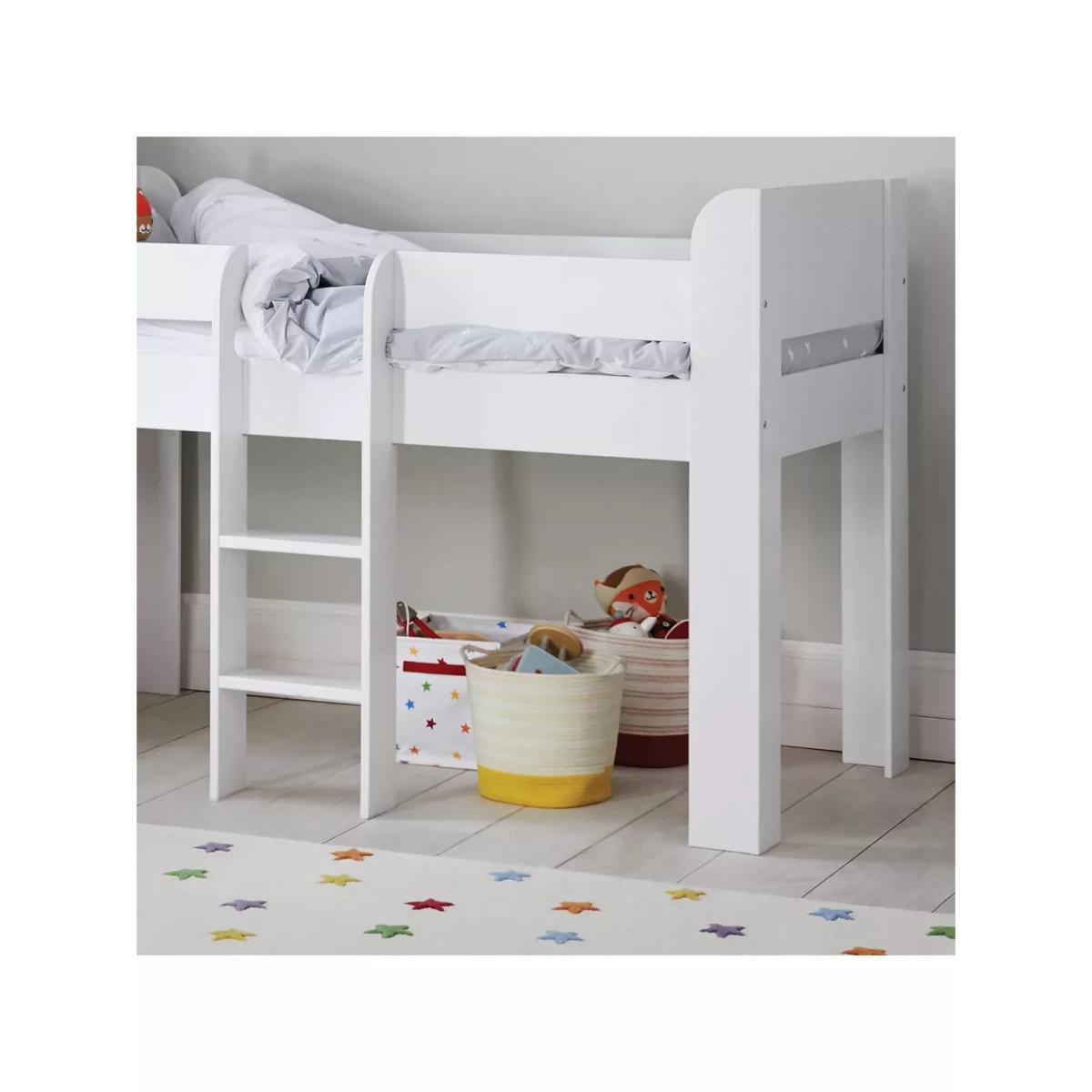 This Mid-Sleeper bed frame is designed to make the most of your space. It's built at a handy height for parents to be able to check on their little one and there's plenty of useful room below for play, storage or sleepovers. It's made from sturdy MDF panels and the base is made from solid pine wood in a painted finish. Good to know Compatible single mattresses are available to purchase separately. The solid slats in this bed frame provide a firm and more supportive base for their mattress. This frame is suitable for children 6 years+ and has been tested to British Standard BS EN: 747. Want to see it first? You may want to see and get a feel for the furniture in one of our shops before ordering. We'll be able to tell you where the range you'd like to view is on display.
