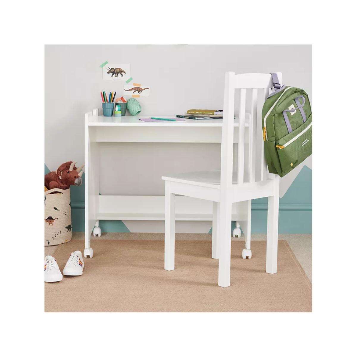 I love this little desk for its clean, simple design and practicality. It works beautifully in Scandi-inspired interiors with monochrome or pastel colour schemes, bringing a fresh and organised feel to a child's space. Its compact size makes it ideal for smaller rooms or corner areas, while the white finish ensures it blends seamlessly with various decor styles. Practical styling tips include pairing it with colourful storage baskets or funky desk accessories to add personality, and positioning it near a window to maximise natural light for both play and study sessions. This desk is a versatile piece that can grow with a child, fitting effortlessly into both playful and minimalist interiors.