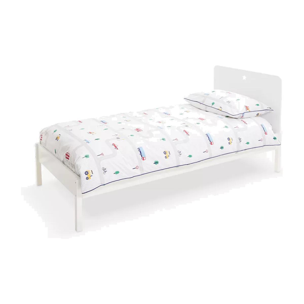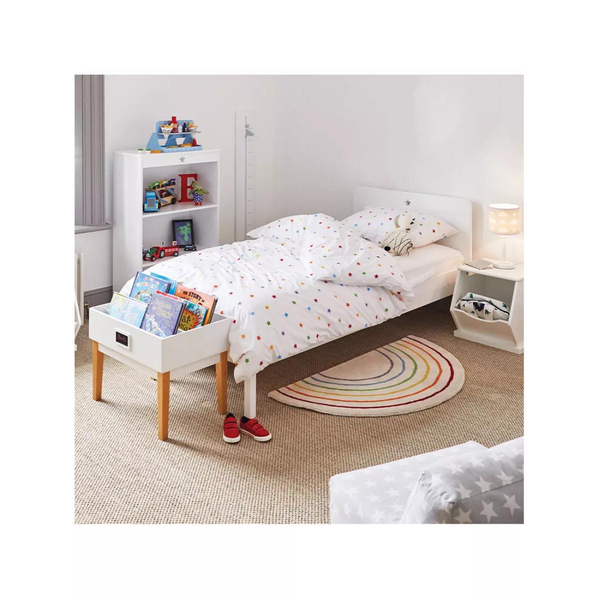 Part of the Star Bright range from Great Little Trading Co, this single bed frame is made from high-quality MDF in a painted finish. The integrated headboard features a cute star cut-out, and its curved edges create a softer design focus. The solid slats in the base are made from pine and will provide a firmer foundation for their mattress. This bed frame is supplied flat pack for easy assembly. Worth Knowing: Child Compliant bed frames This bed conforms to BS 8509:2008+A1:2011 (Childrens beds for domestic use. Safety requirements and test methods). We recommend it is used with a standard single mattress, L190 x W90cm. Not suitable for children under the age of 4 years. Want to see it first? You may want to see and get a feel for the furniture in one of our shops before ordering. We'll be able to tell you where the range you'd like to view is on display.