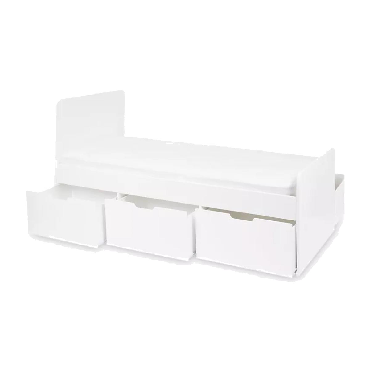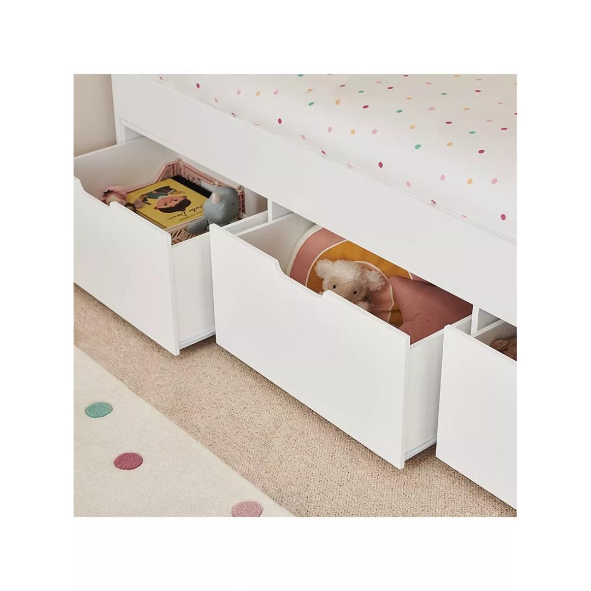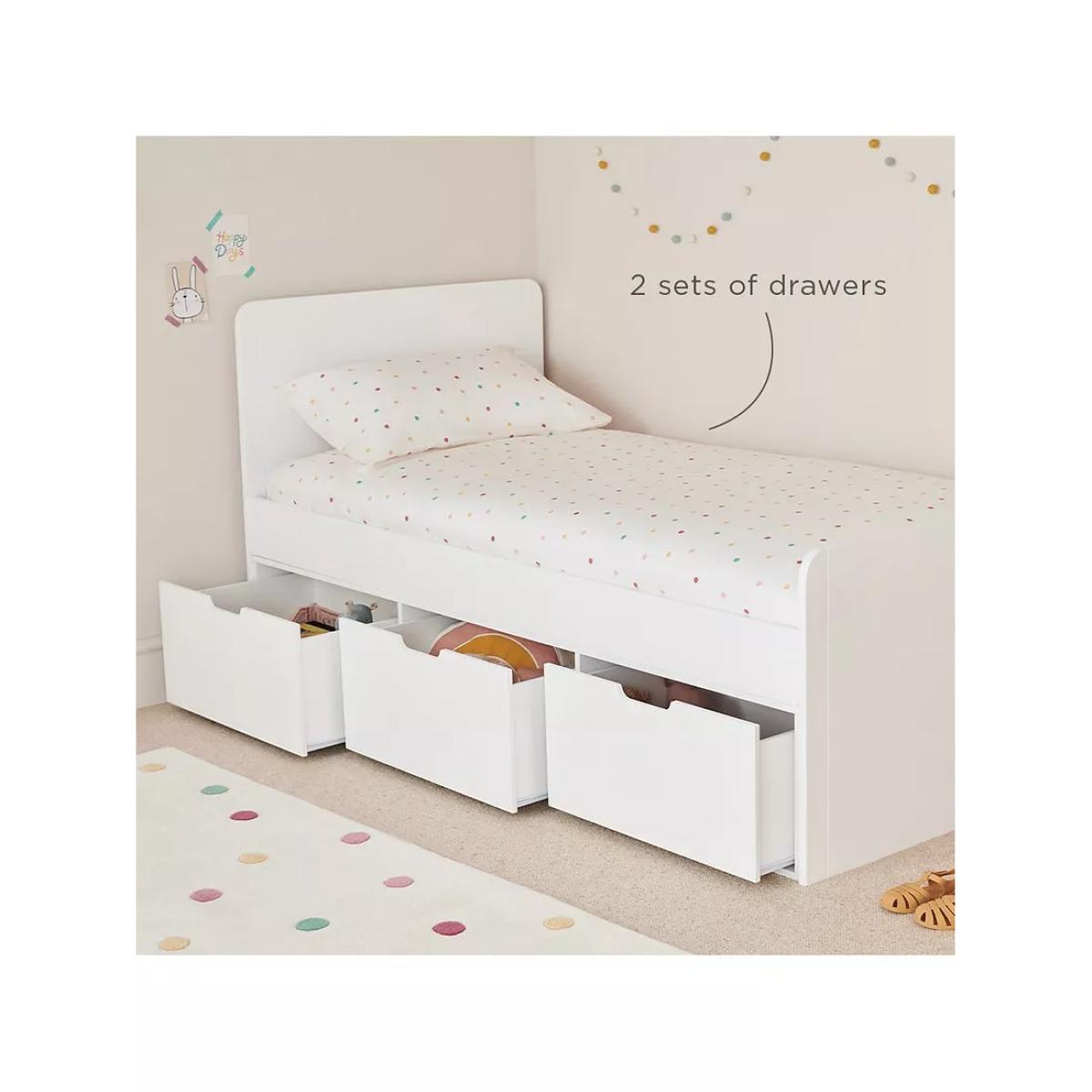 Take control of bedroom clutter with this 2-in-1 single bed and storage set-up from GLTC. Featuring 6 deep, under-bed drawers, the Stowaway Single Storage Bed keeps toys, clothes and bedding out of sight without the need for additional bedroom storage - a great option for smaller bedrooms. It's made from sturdy MDF, has pine slats and comes with a clean, painted finish. Like all GLTC children's furniture, it's designed and tested for safe use by children. This bed requires a standard UK single mattress. It is essential you follow all assembly instructions to the letter so that your bed complies with British Standard regulations. We do not recommend the use of power tools on any MDF panels. Max weight 100kg. The bed is tested and conforms to BS 8509:2008+A1:2011
