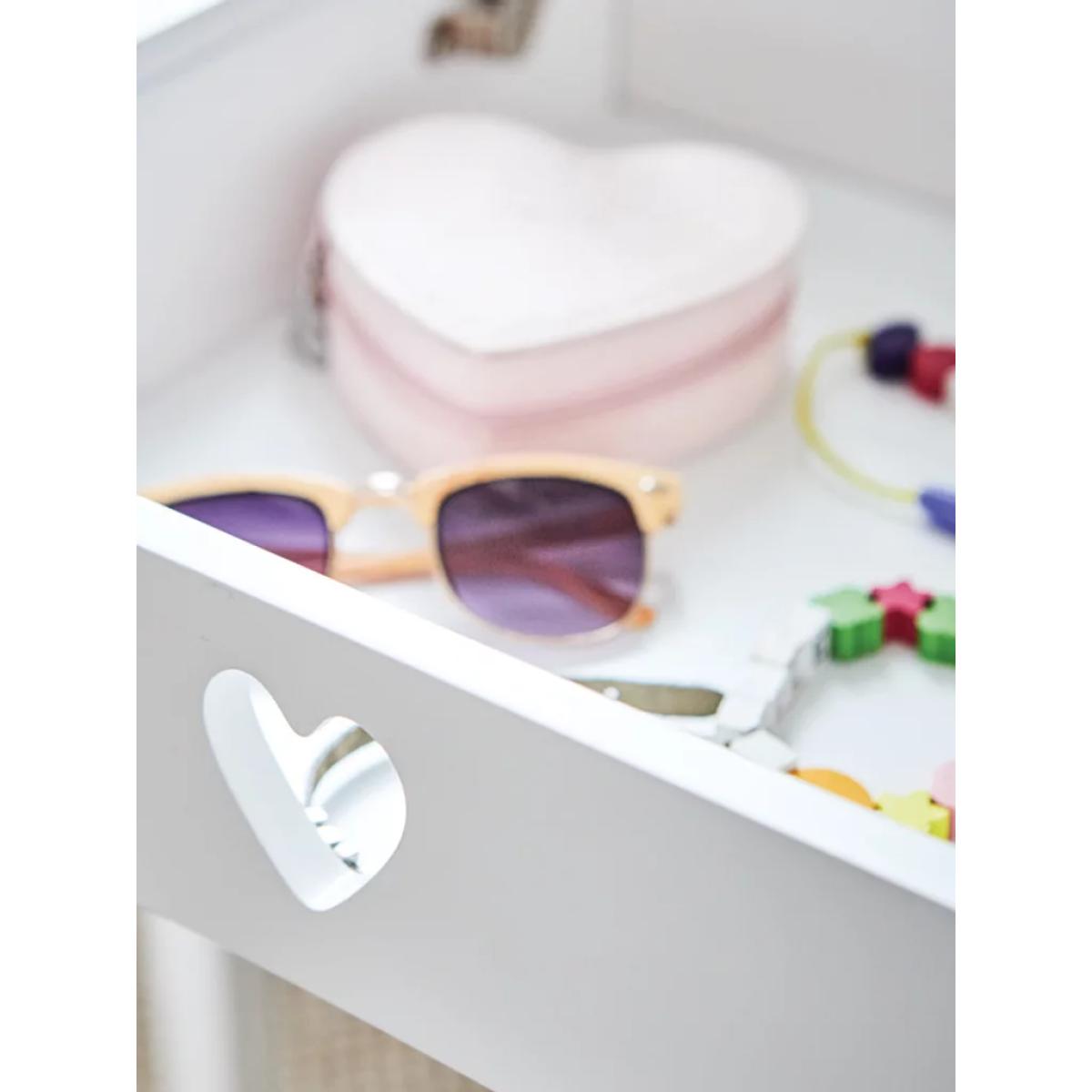 The Sweetheart dressing table and stool set adds a charming and practical touch to a child's bedroom or dressing area. I love how its simple, clean design with soft heart details offers both function and sweetness, making it versatile across various interior styles - from Scandi minimalism to more playful, eclectic schemes. When styling, pair it with light colours or pastel tones to keep the look fresh and airy, or introduce gentle accessories like vintage-inspired jars or floral accents for a cosy feel. Practical tips include keeping it clutter-free by using small organisational trays for jewellery and hair accessories, and adding a cushioned stool to create a comfortable spot for dressing them up. Its understated style makes it a timeless piece that will grow with your child and can be easily integrated into different thematic schemes over the years.