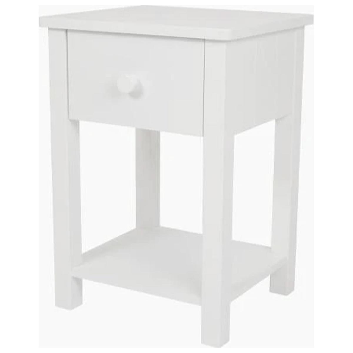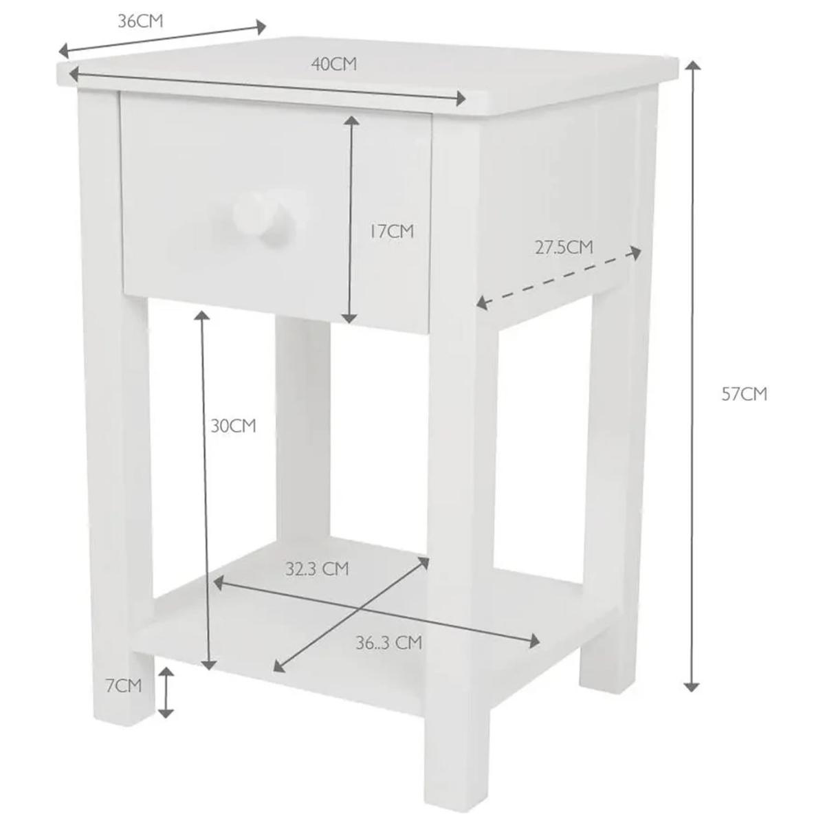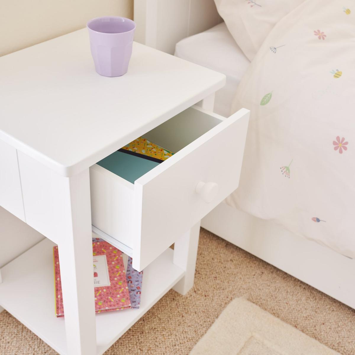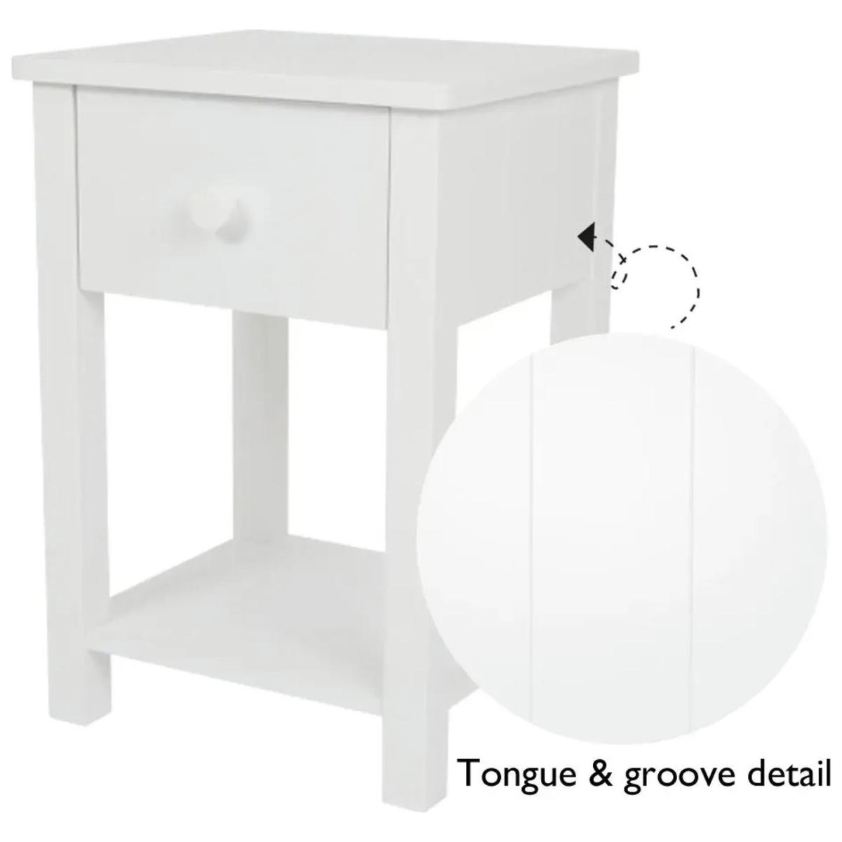 This Lulworth Bedside Table combines timeless design with practicality, making it the perfect addition to any bedroom. Crafted in a smart, white finish with tongue and groove detailing on the sides, its classic good looks ensure it will never go out of style, and you'll always find a place for it, no matter how your decor evolves. The table features a handy shelf and a useful drawer, providing convenient storage for bedtime essentials and a perfect spot to place a lamp. Enhance your child's room with the Lulworth Bedside Table—a stylish, durable, and practical solution that will last for years. Made of MDF and wood. Wooden handles. Additional handles not included. 1 drawer with plastic runners. Self-assembly - 2 people recommended. If this product is over 60cm high it must be securely attached to the wall to prevent overturning. Dimensions: Size H57, W40, D36cm. Weight 11kg. Package Dimensions: Package 1 dimensions: H63, W43.5, D18.2cm. Package 1 weight: 13kg. General information: Manufacturer's 1 year guarantee.