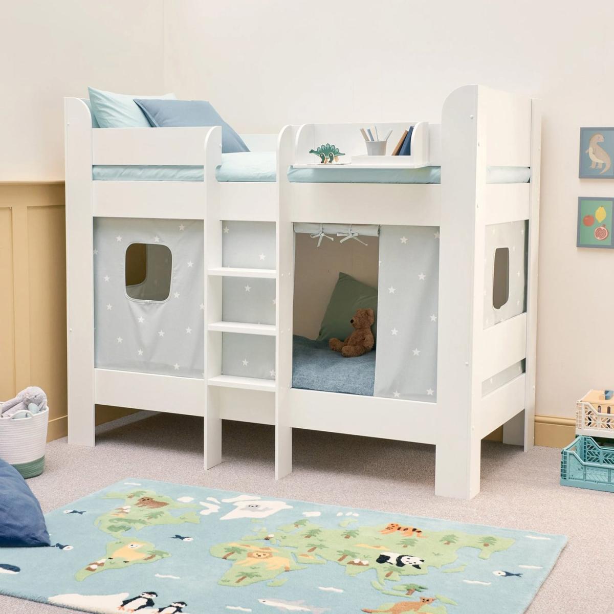 Create a cosy and playful space with this beautiful bunk bed, designed to fit seamlessly into any room layout. Featuring a central ladder for easy access, the bed is as functional as it is stylish. The fun, colourful bed curtains add an extra layer of charm, perfect for sparking a child's imagination, while offering a little extra privacy for the sleeper on the top bunk. One of the standout features is the ample space underneath the top bunk — perfect for sitting with your child for a bedtime story or creating a little nook for reading. For even more storage options, consider adding the Paddington Storage Shelf, designed to keep toys, books, and essentials neatly organised. Bunk:Single bed. Grey bed with a mdf frame. Includes wooden slats. Self-assembly - 2 people recommended. WARNING "This product must be attached to a wall or building structure". Ladder is in a fixed position. Can be used as 2 single beds. Maximum user weight per bunk 100kg. For ages 6 years and over. Suitable for adult use (safety tested to 100kg). Mattresses:For safety, maximum depth of mattress to be used on top bunk is 16cm. Dimensions:Frame size L197, W106.5, H162cm. Height between bunks 70.7cm. Clearance between floor and underside of bed 20.4cm. Bed weight 69kg. Package dimensions:Package 1 size H557.6, W103.2, D50.2cm. General Information:Manufacturer's 5 year guarantee.