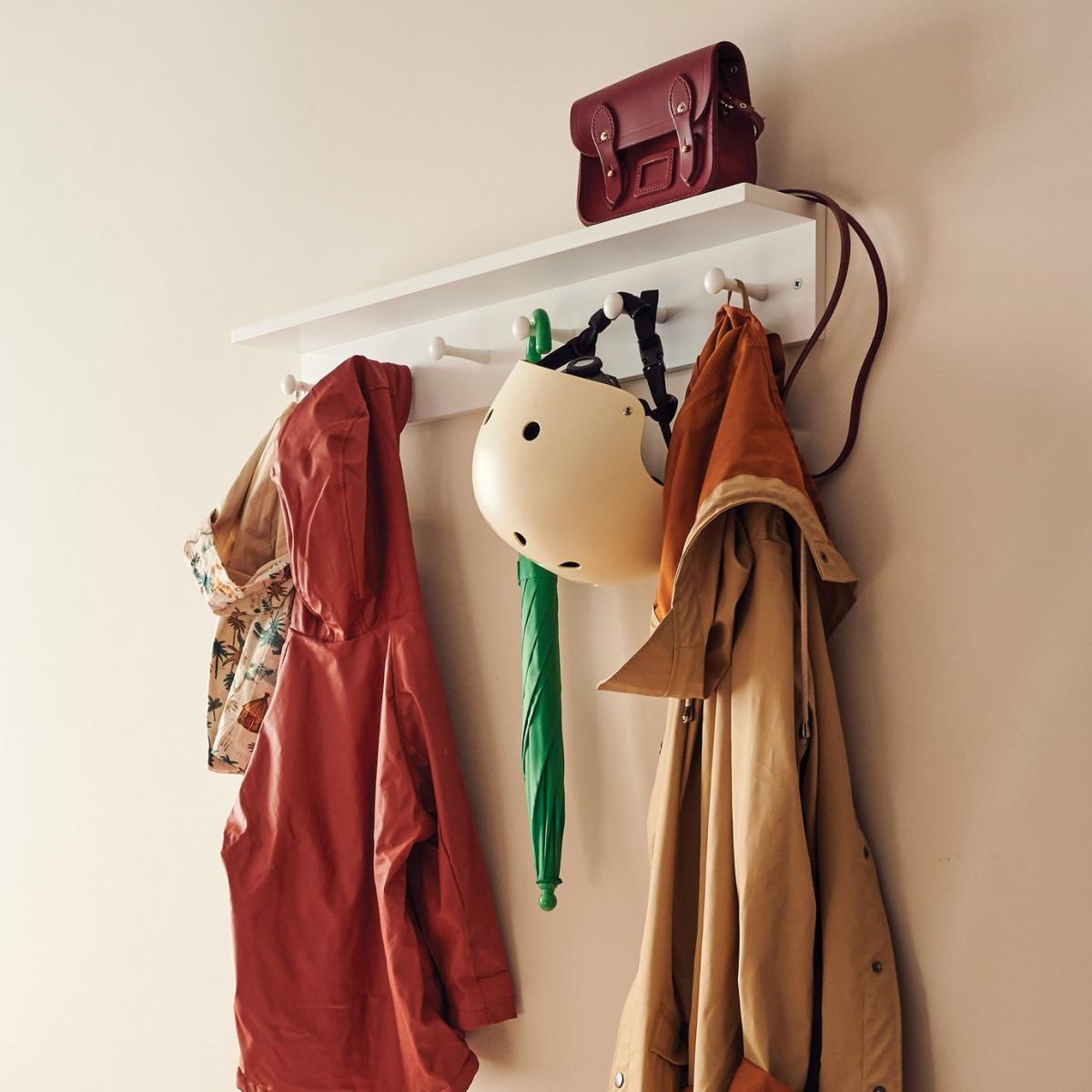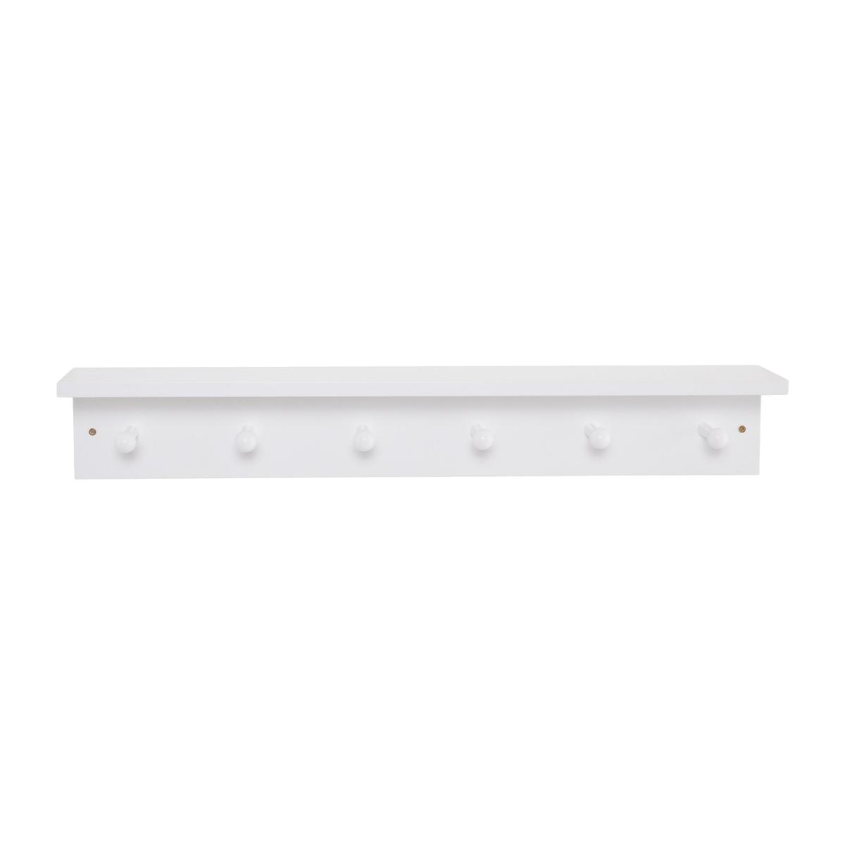 Take your storage potential to new heights with our simple peg rail with shelf. We love the practical ledge for keeping small bits and pieces organised, while the sleek design makes it a stylish addition to any room. Whether hung in pairs or groups, this versatile piece looks great in nurseries, bedrooms, hallways, or kitchens, offering both function and flair. Featuring two recessed holes for easy mounting, this peg rail is ready to be fixed to your wall. Perfect for hanging coats, bags, or accessories while keeping essentials within reach. 6 hooks. 1 shelf. Size H11.6, W72, D11.6cm. Manufacturer's 1 year guarantee.